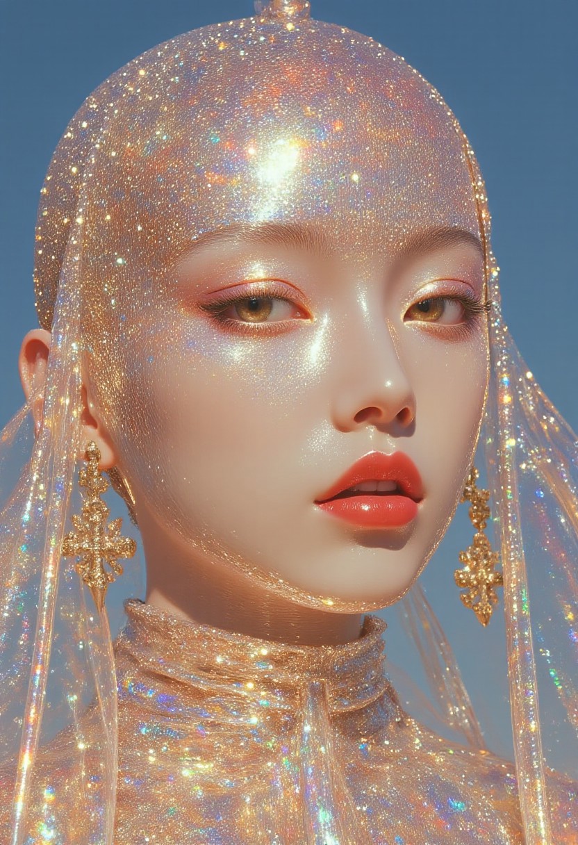 high quality, hyper-detailed, avant-garde photograph, Nepalese woman, pale light brown skin, clear light blue sky, full-face close-up, smooth flawless complexion, iridescent striped face markings, artistic touch, shimmering metallic eyeshadow, piercing gaze, glossy deep red lips, bold contrast, intricately detailed golden earrings, Christian Holy Cross shape, reflective surfaces, modern allure, metallic urban Buddhist monk clothing, turtleneck, avant-garde fashion, dynamic interplay with reflections, minimalist background, eye-catching fashion, Sony A7R IV, 50mm f/1.2 G Master lens, beauty editorial, contemporary fashion, Sølve Sundsbø inspiration, mythp0rt style, niji_flux style, sleek high-fashion vision, glow_skin, iridescent skin, oily skin, striking portrait, cinematic lighting, sharp focus, rich textures, artistic elegance, surreal fashion aesthetic.