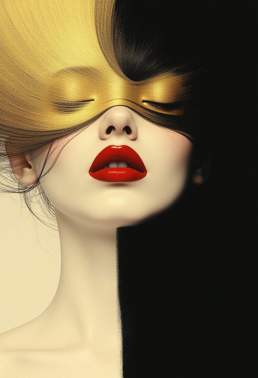Tony Rodriguez style. The image is a digital artwork featuring a stylized portrait of a woman's face. The woman's face is depicted in a minimalist, abstract style with a focus on her lips, nose, and eyes, which are obscured by a swirling, abstract pattern of gold and black. The gold elements have a metallic, reflective quality, adding a sense of luxury and sophistication to the piece. The black areas are dark and textured, creating a striking contrast with the lighter areas.