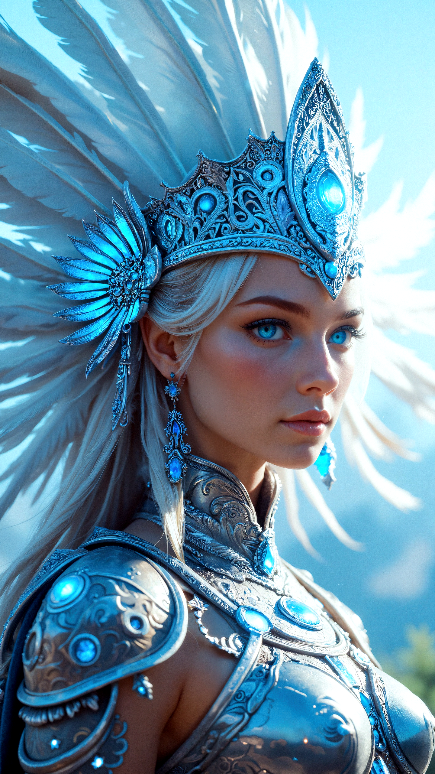 A hyper-detailed, 3/4 portrait of a divine warrior queen, her majestic feathered headdress rising like a crown of pure light. Her alabaster skin glows under the soft, radiant illumination, while her icy blue eyes reflect strength and resolve. Her battle armor is an exquisite blend of silver and white, adorned with glowing sapphires and engraved with intricate patterns. The feathers of her headdress flow gently, as if moved by a celestial breeze. The background features soft beams of light breaking through a twilight sky, adding depth and serenity to the composition.