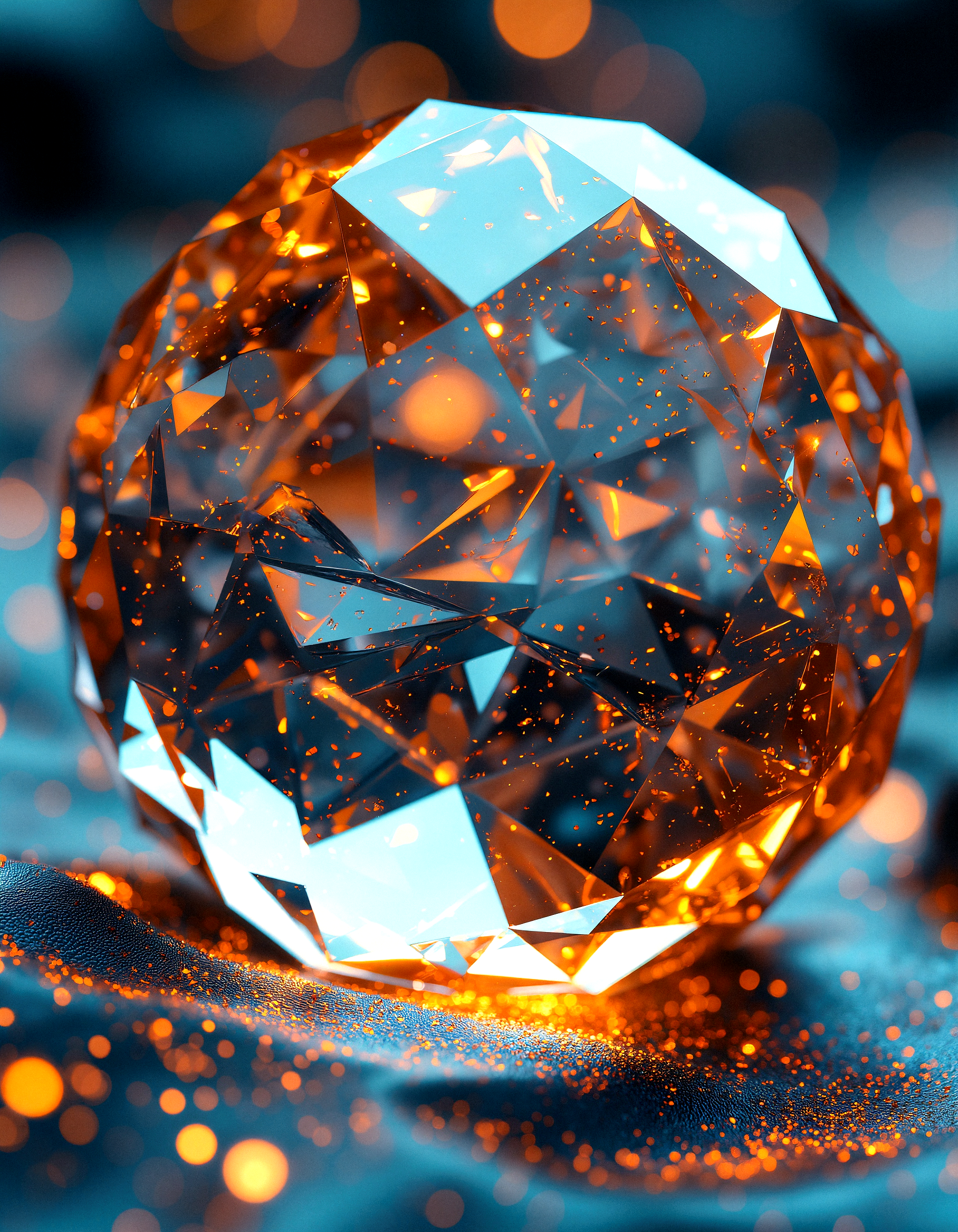 "A close-up of a multifaceted crystal sphere, its geometric facets refracting light into dazzling patterns of gold, orange, and blue. The sphere floats above a rippling surface illuminated by scattered glowing particles, resembling stardust. Each facet of the sphere reflects intricate details of its surroundings, creating a kaleidoscopic effect. The background is a soft blend of rich blues and fiery oranges, with dynamic bokeh highlights that enhance the magical and futuristic aesthetic."