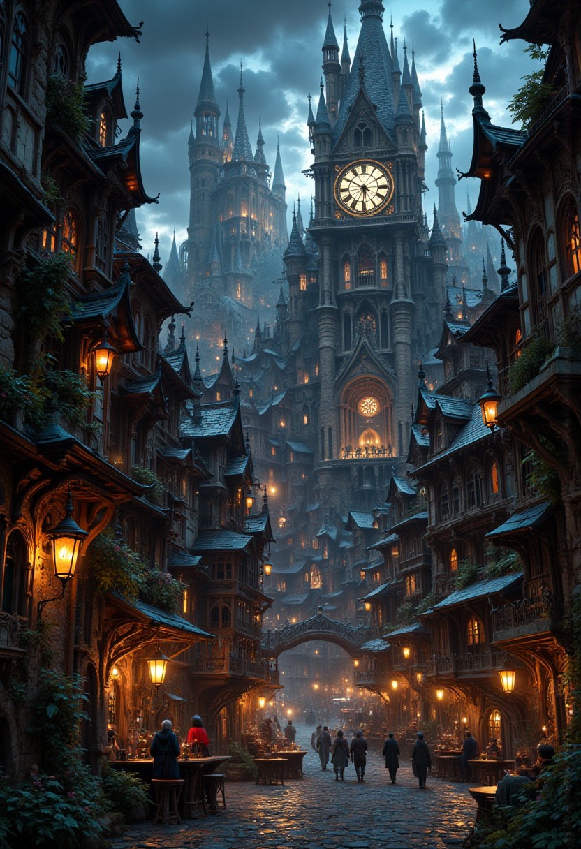 Image of a medieval city with a giant clock in the middle best quality, whimsical, fantastic, splash art, intricate detailed, hyperdetailed, photorealistic, concept art, harmony, serenity, tranquility, glow, glowing, ambient occlusion, halation, cozy ambient lighting, dynamic lighting,masterpiece, liiv1, linquivera, metix, mentixis, masterpiece, award winning,