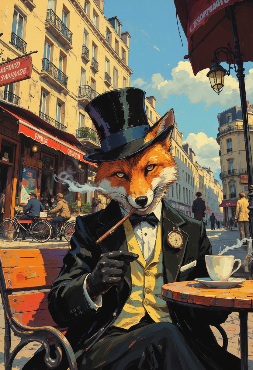 A lively anthropomorphic fox wearing a black tophat, dressed in a tailored suit with a pocket watch, sitting on a wooden bench outside a Parisian-style coffee shop. The fox is holding a steaming cup of coffee in one paw and a smoking cigar in the other. The bustling urban backdrop features cobblestone streets, vintage bicycles leaning on lampposts, and pedestrians in 1940s attire. Bright sunlight bathes the scene, casting soft shadows. Vibrant colors, detailed textures, DB4RZ, DB4RZ style painting, NeoPigma, in the style of cksc, anime, cyberpunk