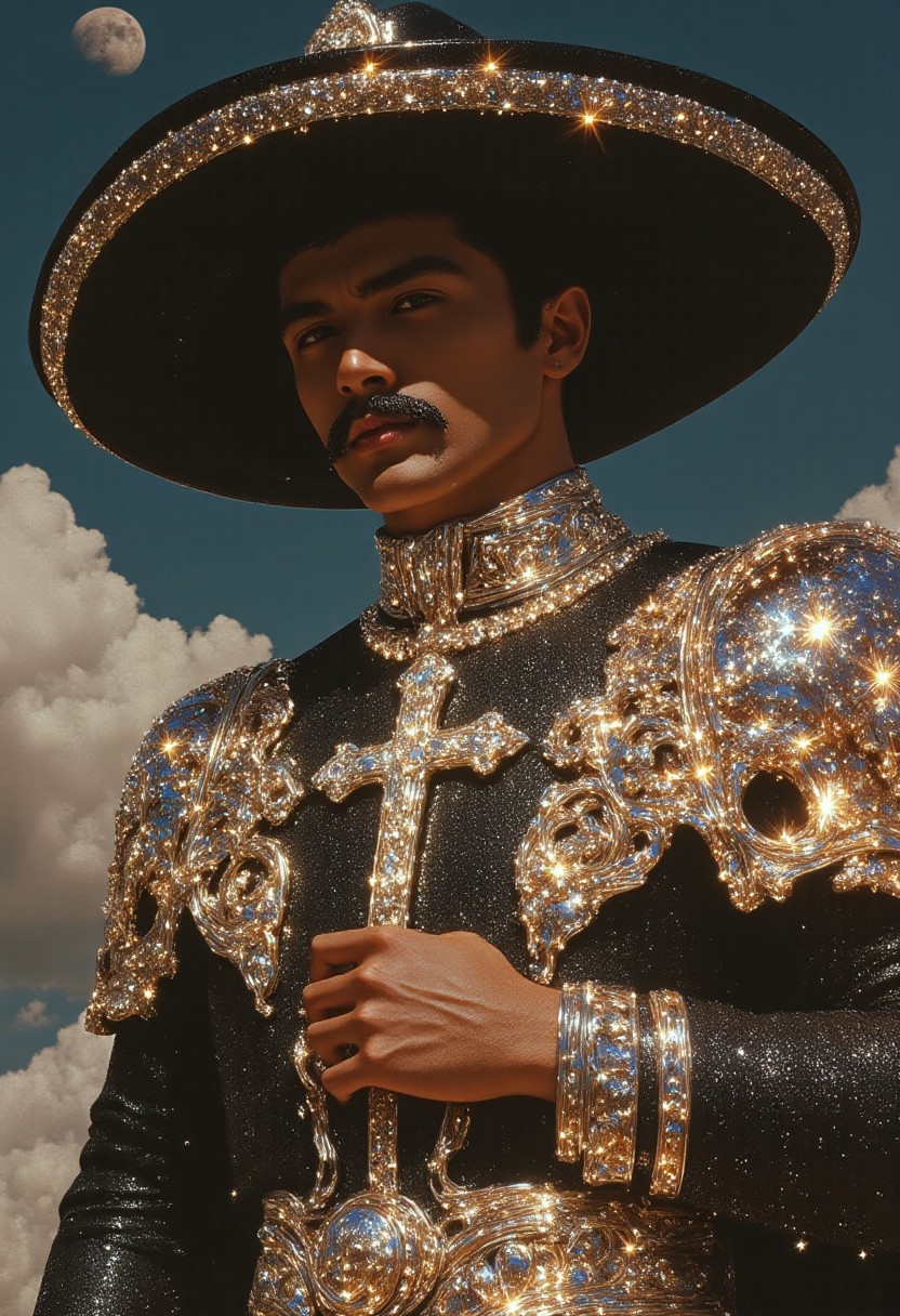 A midshot, hyper-detailed photograph capturing a young Mexican man with medium-toned skin, exuding cultural pride and elegance. His face is adorned with a thick, traditional Mexican-style mustache, enhancing his strong, confident features. A sleek black sombrero crowns his head, its brim and crown outlined with radiant rhinestone diamond stimulants that sparkle brilliantly in the light, creating a dazzling, intricate pattern. Around his neck, he wears a bold chain necklace with a holy cross locket crafted from sparkling diamond simulants, each facet catching the light and adding a divine brilliance to his presence. His attire reimagines traditional Mexican fashion in an avant-garde style, with a fitted white shirt under a striking charro-inspired jacket. The jacket features asymmetrical, exaggerated lines with textured black fabric and ornate rhinestone embroidery in swirling floral and geometric motifs, shimmering with every subtle movement. The interplay of light and shadow accentuates the dazzling rhinestones, drawing attention to the luxurious craftsmanship. The background is a vivid sky of fluffy white clouds, with a subtle daytime moon adding a serene yet surreal atmosphere. His commanding pose, with one hand lightly adjusting the edge of his jacket, highlights the fusion of cultural tradition and contemporary high-fashion aesthetics in this visually stunning composition.