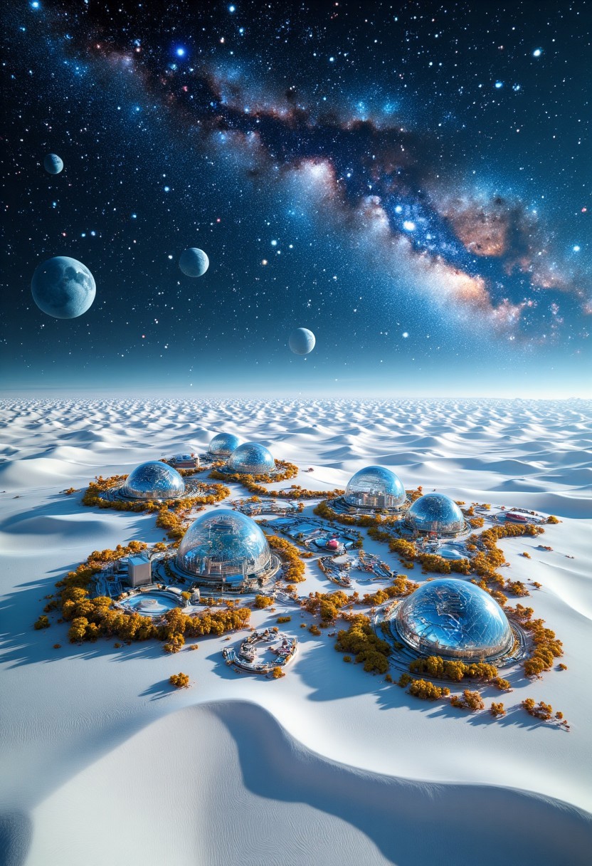 Design a futuristic habitat set on a desert planet with endless white dunes shimmering under an intense, glaring light. The habitat features interconnected glass domes and flat, transparent structures sprawling across the sand, sheltering vibrant greenery and sleek, advanced buildings within. The reflective surfaces of the glass create dazzling light patterns against the stark white dunes, blending futuristic architecture with the planet's natural beauty. In the sky, a trio of radiant moons looms overhead, casting soft light, while a blindingly vivid galactic nebula and a sprawling Milky Way dominate the celestial canvas. . The hyperrealistic image highlights the juxtaposition of the harsh desert environment with the luminous, thriving oasis. A surreal yet harmonious blend of cutting-edge technology and the raw magnificence of alien nature. Cinematic style, Realism, Photorealism, High quality, analog photo, Midjourney_Whispe