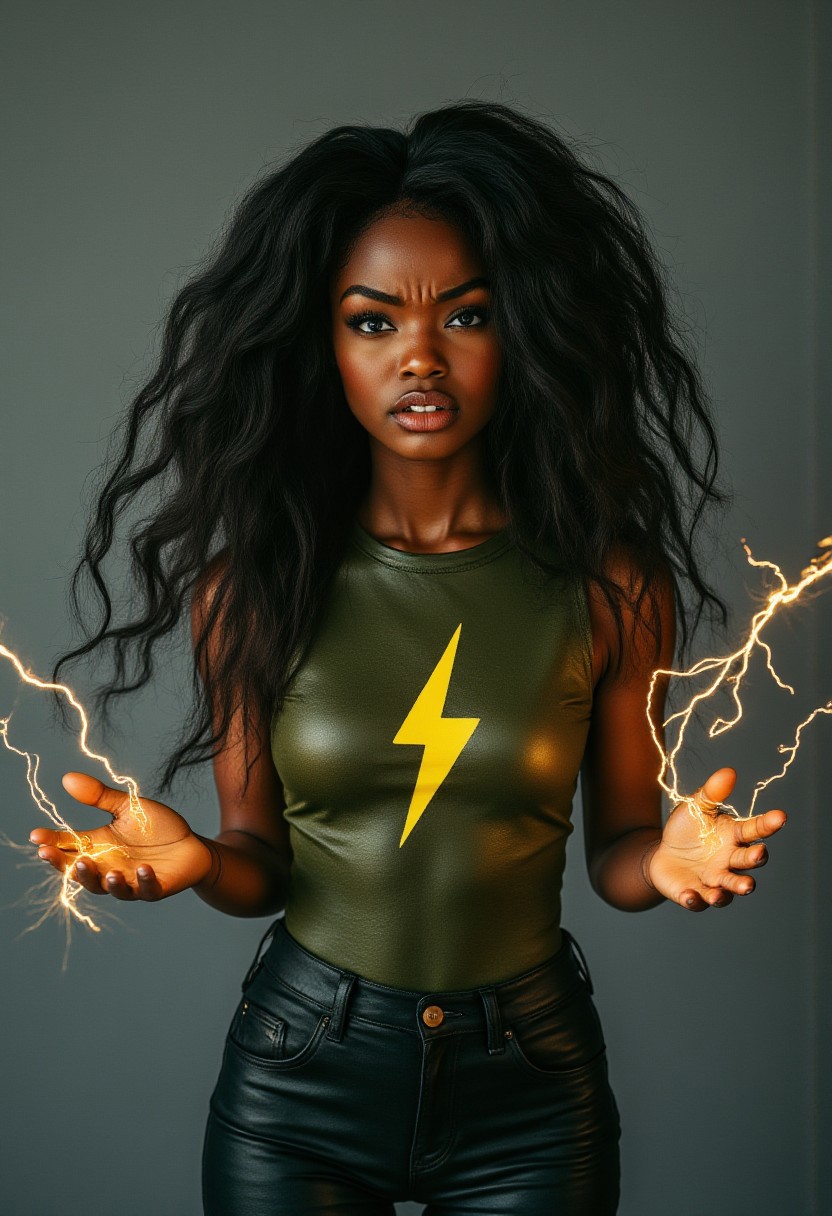 FictionalAbby a black girl, shooting black lightning from her hands. Wearing a green leather bodysuit with a yellow lightningbolt symbol and levitating. Electric font text "Buzz Queen"