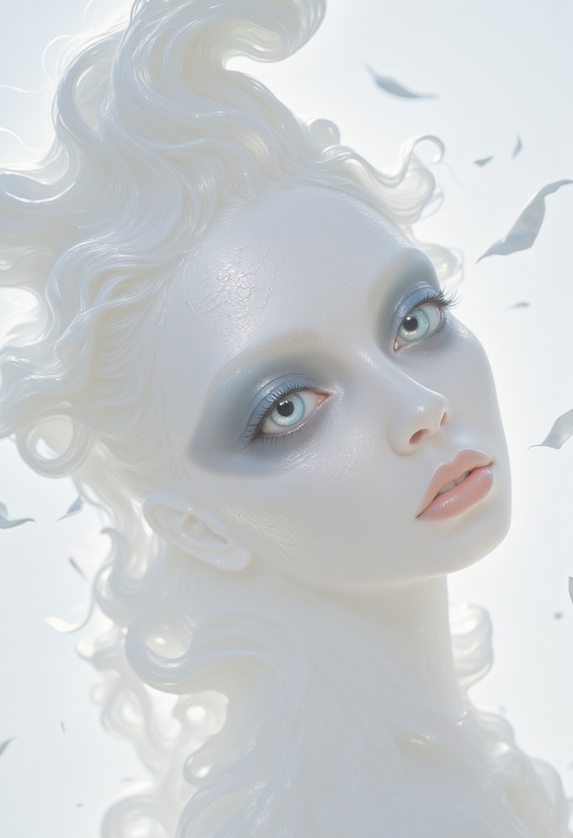 A closeup, surreal, ethereal portrait of a woman with a hauntingly beautiful, almost angelic presence. Her pale complexion is luminescent, blending seamlessly into the pure white background, creating an impression that she is emerging from light itself. Her very large piercing blue eyes are the focal point, their crystalline clarity and soft glow conveying a sense of otherworldly wisdom and calm. Her long lashes are bold and dramatic, contrasting starkly against her porcelain skin, drawing the viewer's gaze deeper into her haunting stare. Her features are delicately sculpted, with high cheekbones, a perfectly straight nose, and soft, full lips that hold a subtle, neutral expression, suggesting serenity and quiet strength. Her platinum-white hair flows and floats softly upwards, emphasizing her celestial appearance. The fine strands are light and wispy, blending seamlessly into the white backdrop with white ashes falling around her, adding to the ethereal atmosphere. The lighting is diffused and even, erasing shadows and creating a minimalistic aesthetic that places full focus on her striking features. The overall composition feels timeless, as if capturing the essence of purity and perfection, with a soft, dreamlike quality that invites introspection and awe. The simplicity of the image enhances its mystique, creating a profound, angelic presence that feels both familiar and otherworldly.
