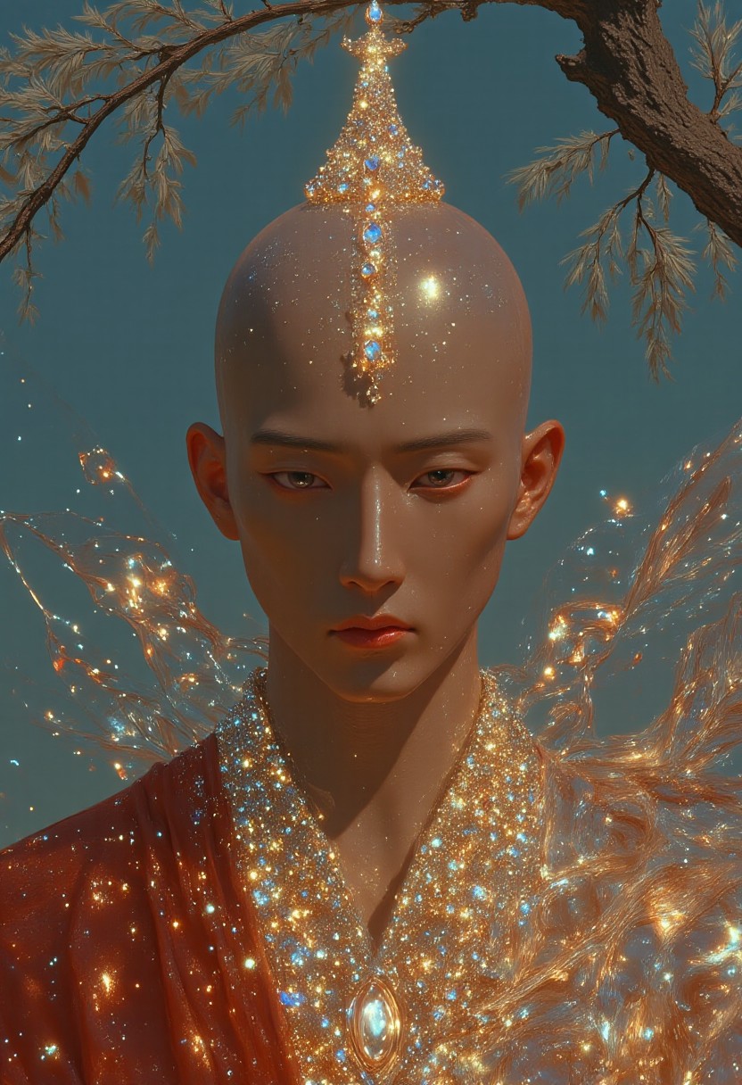 ((dramatic stylizing, hyper-realistic, surreal elegance, 8K ultra-HD)) -- A hyper-realistic portrait of a young Chinese Buddhist monk, his smooth, bald head and clean-shaven face reflecting the purity of his serene demeanor. His flawless skin, free from body hair, embodies tranquility. He wears an elegant Buddhist robe, intricately adorned with rhinestone diamond stimulants that gleam with white sparkling brilliance. The rhinestones, delicately sewn into the fabric, form intricate patterns across the robe, casting dramatic bursts of white light with every movement. The robes' rich, deep colors contrast with the twinkling stones, emphasizing their dazzling effect. Around his neck, a bead necklace, also adorned with small rhinestone diamonds, catches the light with subtle glimmers, complementing the diamonds on his robe. In the background, a slender, graceful branch of a willow tree sways gently in the breeze, its fine leaves rustling under the soft wind, framed by a serene, sky-blue sky that stretches above. The dramatic use of rhinestone diamonds highlights the monk's calm presence while enhancing the spiritual yet modern aura of the scene.