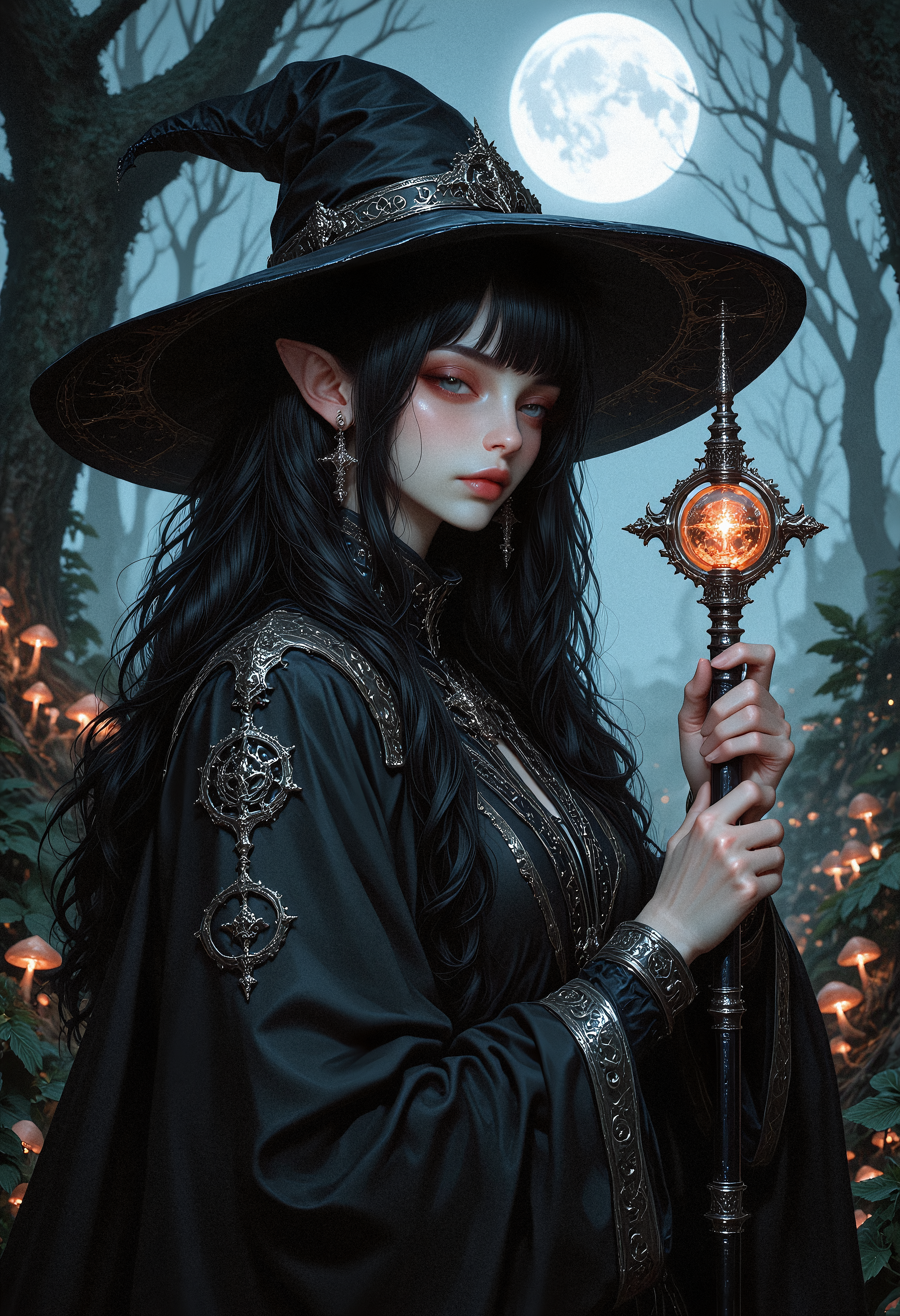An1meL1nes, face close up, gorgeous perfect eyes, highly detailed eyes, glossy lips. A digital fantasy artwork featuring a witch with long, wavy black hair, slightly pointed ears, and a soft glow emanating from her youthful features. The woman is wearing an ornate black pointed hat decorated with silver filigree, flowing black robes adorned with arcane symbols, and she wields a magic staff topped with a shimmering crystal orb. The background is a lush forest filled with ancient towering trees and faintly glowing mushrooms, softly illuminated by pale moonlight filtering through a canopy of leaves. The composition focuses on her poised stance, her intense gaze brimming with mystical energy, and a subtle magical aura emanating around her staff. The overall color palette is a rich interplay of black and white, highlighting the eerie, enchanted atmosphere while complementing her bright, otherworldly features. (maximum ultra high definition image quality and rendering:3), maximum image detail, maximum realistic render, (((ultra realist style))), realist side lighting, 8K high definition, realist soft lighting, (amazing special effect:3.5). <lora:FluxMythAn1meL1nes:1>