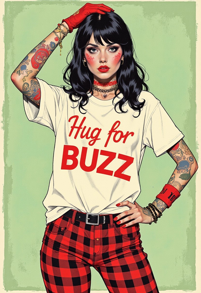 A graphic comics illustration in Pinup art style featuring an alternative woman wearing a large T-shirt that says "Hug for BUZZ", (sfw)