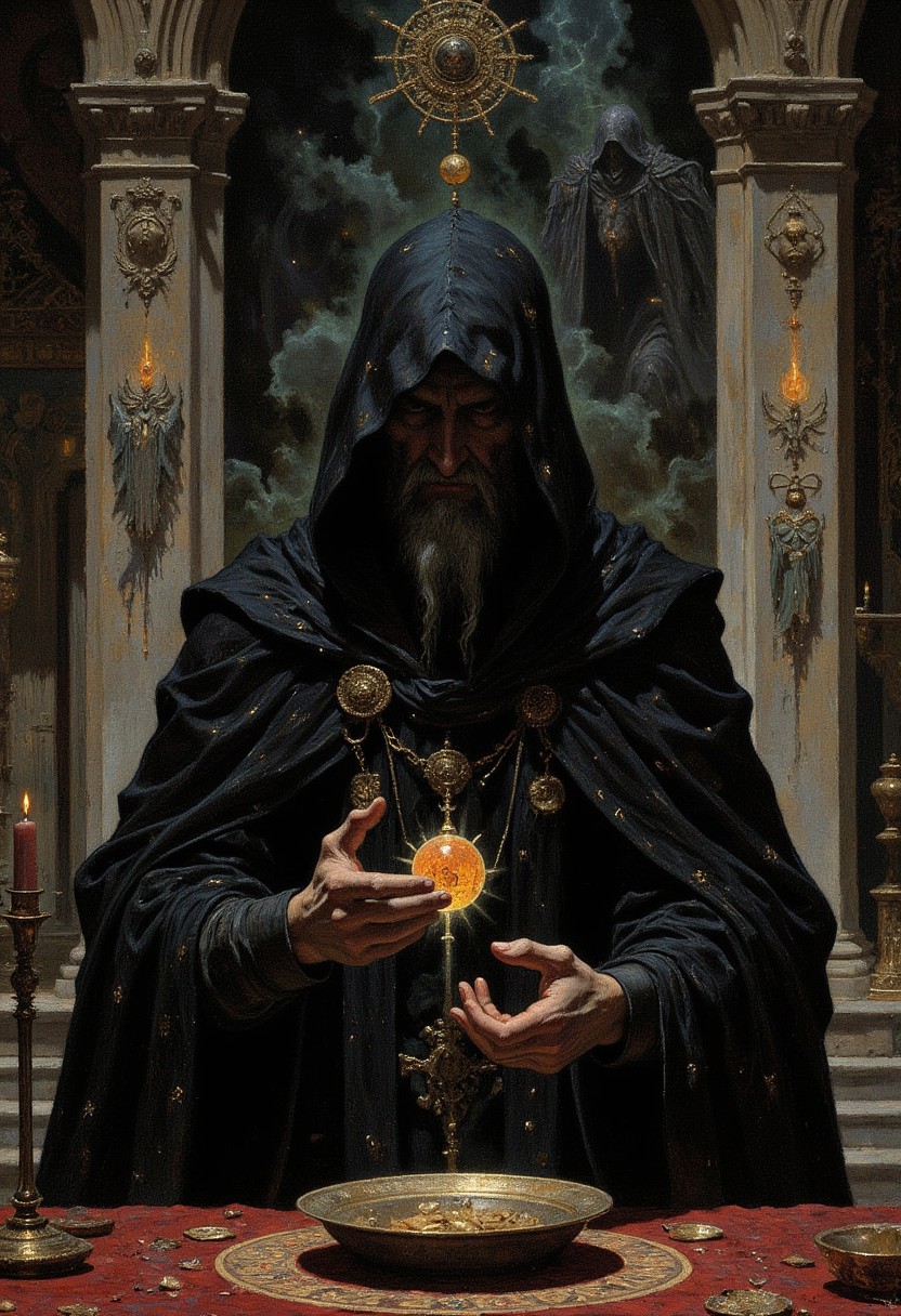 The Man in Black, cloaked and enigmatic, conducting a forbidden ritual in a desecrated church. Around him, arcane symbols glow with a sinister light as he summons specters and shadows, his face a mask of concentration and dark delight.