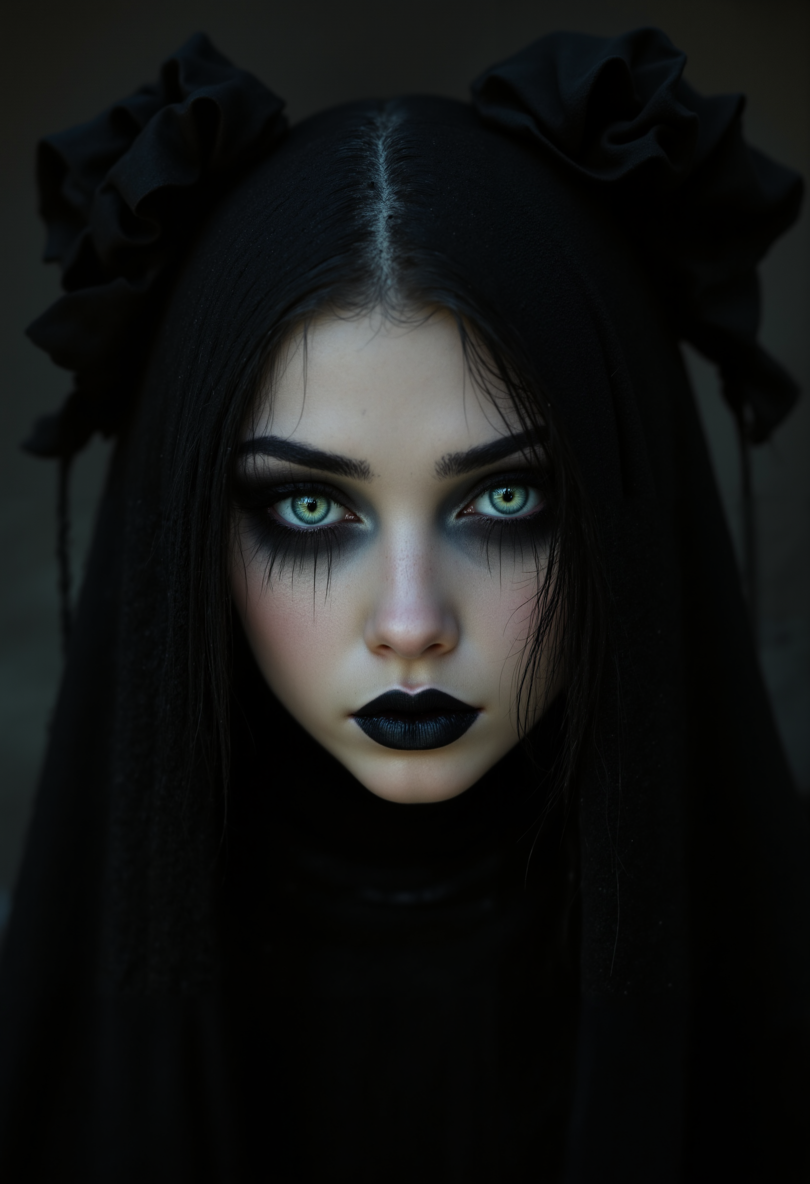 Three-quarter view, closeup portrait of an 18-years-old goth girl, long eyelashes, dark green eyes, dark makeup, black long hair with two sides pigtails.
