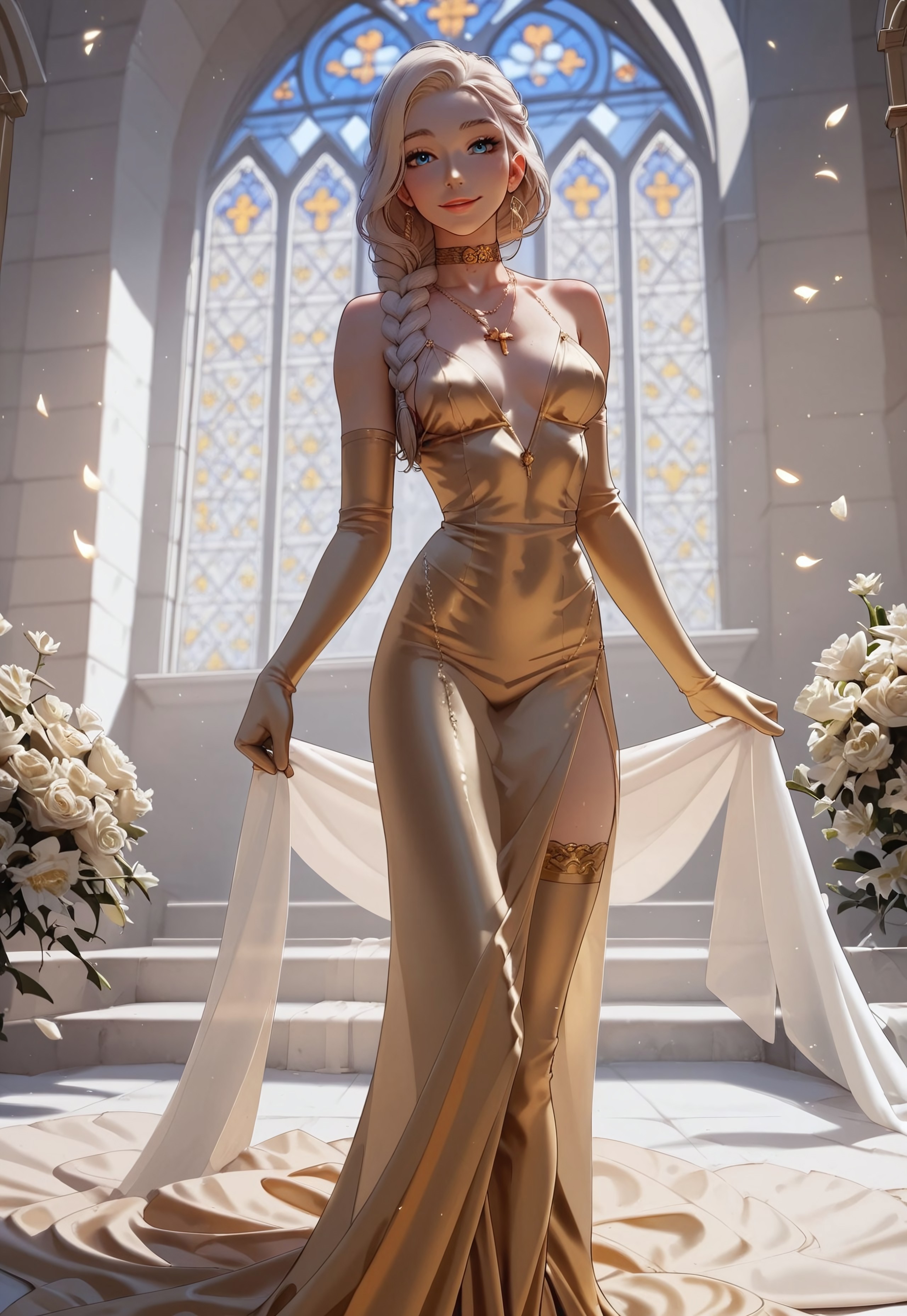 safe_pos, Masterpiece, score_9, score_8_up, score_7_up, score_6_up, Expressiveh, 1girl, (25 years old, beautiful face, aesthetic medium breast, aesthetic slim thighs, long white braided hair, light blue eyes, choker, long ornate gold dress, long dress, gold necklace, long gloves, gold stockings,:1.4) eye contact, smiling, church background,