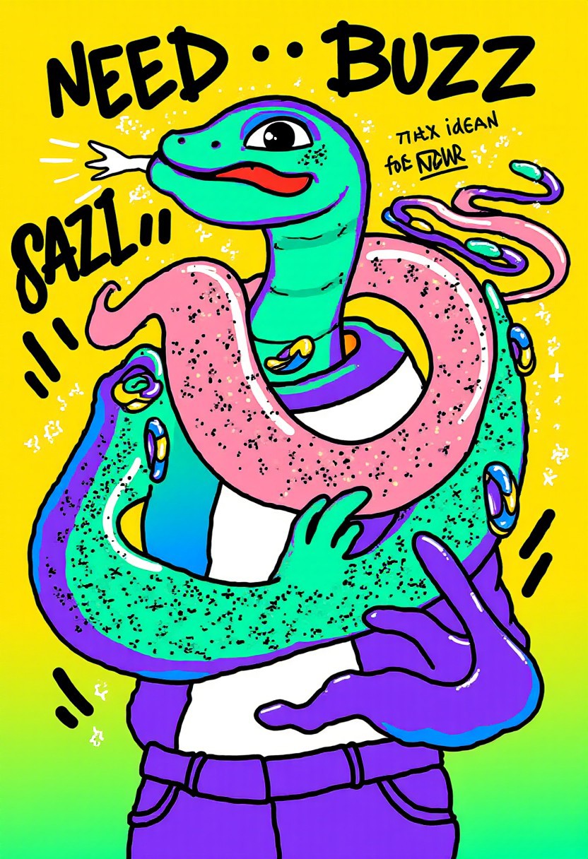 shebaobao. A snake holding a lightning bolt symbol. Caption that reads "Need BUZZ for Flux Snakes!" across top and bottom