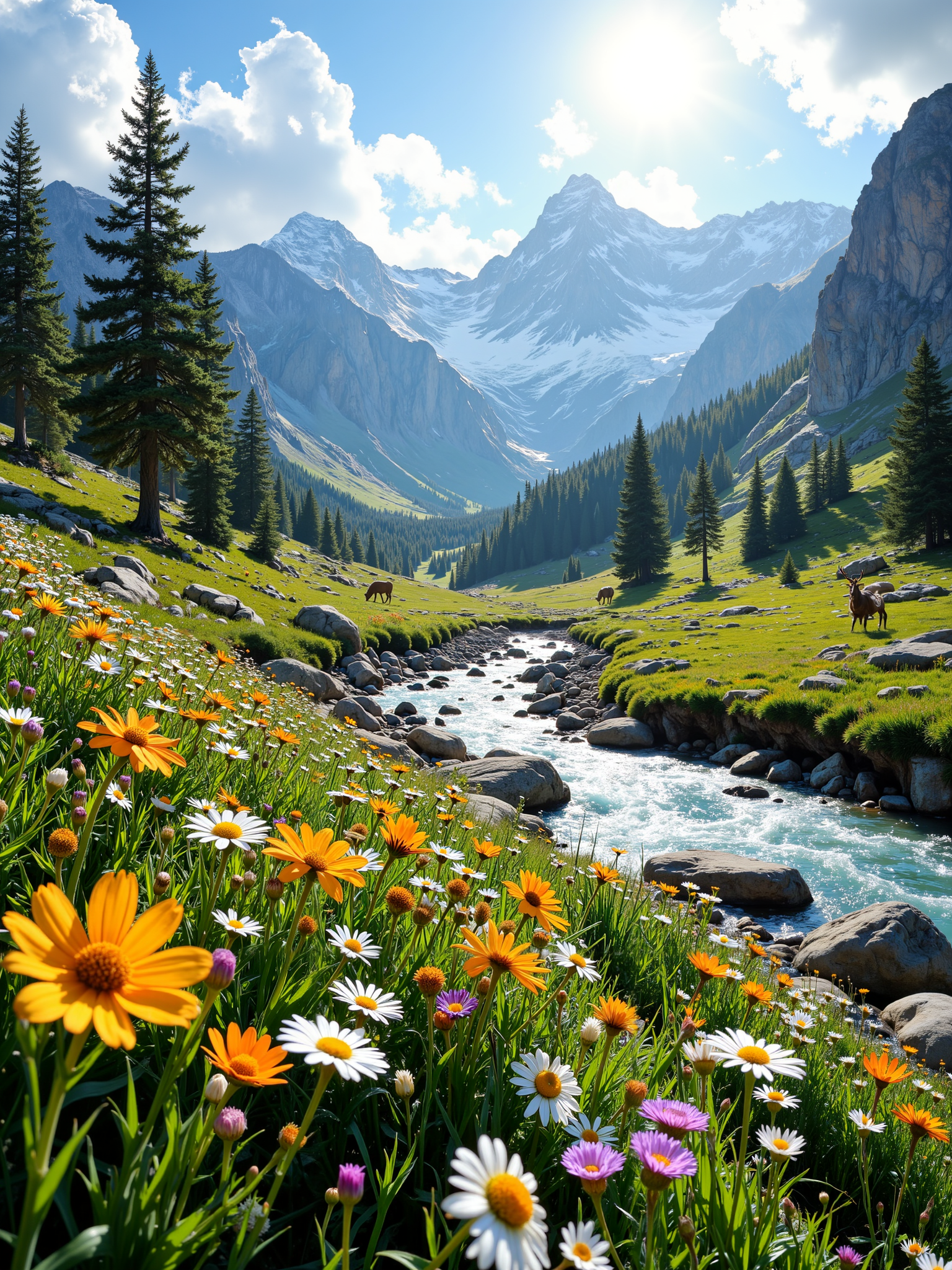 Pristine alpine meadow, wildflowers in full bloom, snow-capped peaks in distance, crystal-clear mountain stream, pure sunlight, lush green grass, scattered boulders, native wildlife grazing, wispy clouds, crisp air, vibrant natural colors, unspoiled landscape, 8k resolution, hyper-realistic detail, golden hour lighting, panoramic view, untouched wilderness, intricate botanical details, serene atmosphere, masterpiece quality <lora:style_of_Norman_Ackroyd_FLUX_100:0.3> <lora:Rainbow_on_black_style-000003:0.9> <lora:Memadukan_Brush_Strokes_of_Fineart:0.3> <lora:SameFace_Fix:0.7> <lora:flux_dev:1>