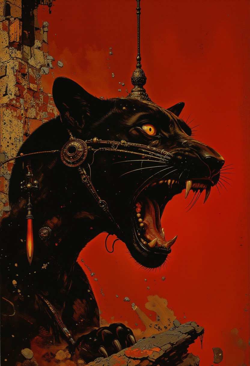 A highly stylized, digitally drawn hyper-realistic side profile of a black panther, its mouth open in an angry snarl, revealing sharp teeth and elongated fangs. The panther's sleek black skin has a chrome tint, giving it a reflective, almost futuristic sheen. Intricate rhinestone diamond stimulant ornaments are placed across its head, face, and body, sparkling and catching the light as it shifts, creating an ethereal, captivating effect. Its intense red glowing eyes pierce through the scene, radiating power and aggression. The background is a vivid, deep red, amplifying the panther's fierce presence and contrasting sharply against its dark, chrome-accented body. The panther's tense posture and taut muscles highlight its predatory nature, while the rhinestone ornaments add a layer of majestic beauty to its raw power. The reflective chrome elements on its skin enhance the dramatic intensity, while its open mouth and glaring eyes evoke an aura of imminent danger and dominance. The composition emphasizes the panther's primal energy against the striking red backdrop. (Frank Frazetta fantasy oil painting:1.2)