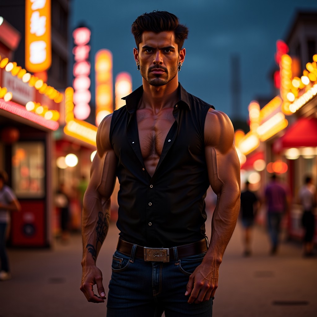 a full length photo of a handsome very short very lean bodybuilder man who is wearing a sleeveless black shirt that is unbuttoned, showing his massive pecs and deep cleavage and he has a deep tan and glossy skin and medium length black hair and glowing red eyes and earrings and he has a narrow waist and narrow hips and a narrow pretty-boy face and is wearing dark blue jeans and is standing in the middle of a haunted carnival at night and he has a huge bulge in his crotch