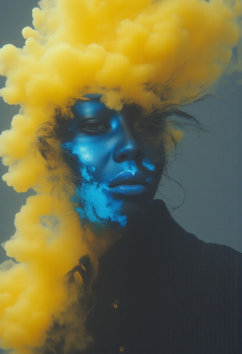 Eye liner, film grain, Japanese Model , smoky ethereal portrait, neon yellow, blue outline of her face in the hazy smoke, one point soruce of light , diffused around the smoke, gel like apperance, slime mixed with areosal themed portrait