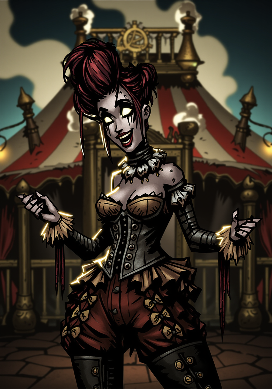 A steampunk-inspired scene of a robotic girl, her metallic skeleton exposed with intricate gears, wires, and cables whirring and clicking as she moves. Her face is a mix of human-like features and mechanical components, with glowing eyes that flicker with a mischievous charm. She wears tattered, yet flamboyant circus attireâa corset adorned with brass buttons, a ruffled skirt with frayed edges, and a top hat tilted jauntily on her head. She stands at the entrance of a mechanical circus, her arms outstretched in a grand, inviting gesture. Behind her, the circus tent looms, its fabric patched and worn, with steam billowing from pipes and gears turning in the background. The air is filled with the sound of clanking metal, hissing steam, and the faint hum of electricity. The atmosphere is a blend of wonder and decay, with the robotic girl as the charismatic ringmaster of this bizarre and fantastical world. The art style is highly detailed, capturing the textures of her metallic body, the intricate machinery, and the vibrant yet worn circus setting. The lighting is dramatic, with the glow of her eyes and the steam creating a sense of mystery and allure. This artwork tells a story of curiosity, adventure, and the strange beauty of a world where technology and whimsy collide, with the robotic girl as the enchanting guide to a mechanical wonderland <lora:DD:1>