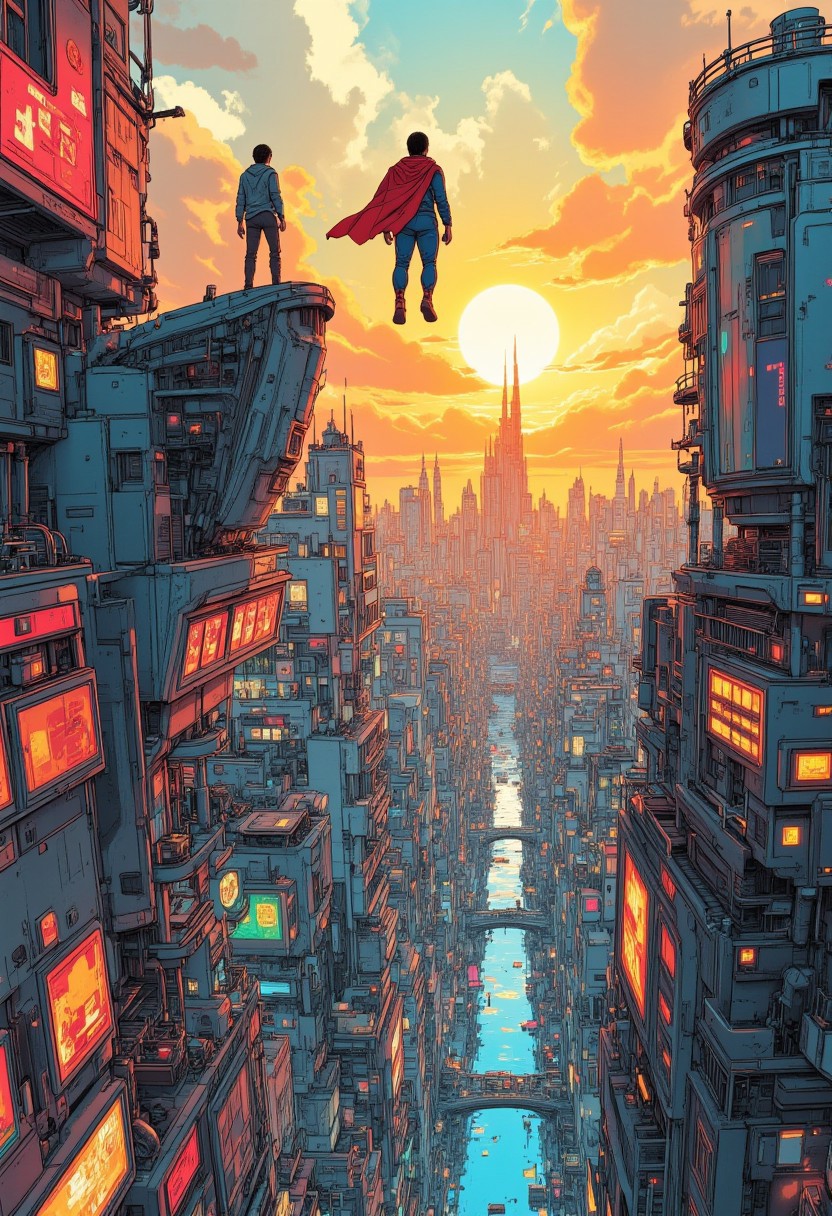 ff-enhance, ff-comic, A superhero wearing a vibrant costume is floating in the air and overlooking a futuristic city from afar. They are a guardian. The city that has withstood the ravages of time. Ephemeral and haunting, chaotic but peaceful. The city represents an ideal. Darker grittier outlines., people and objects in the image are proportionately scaled.