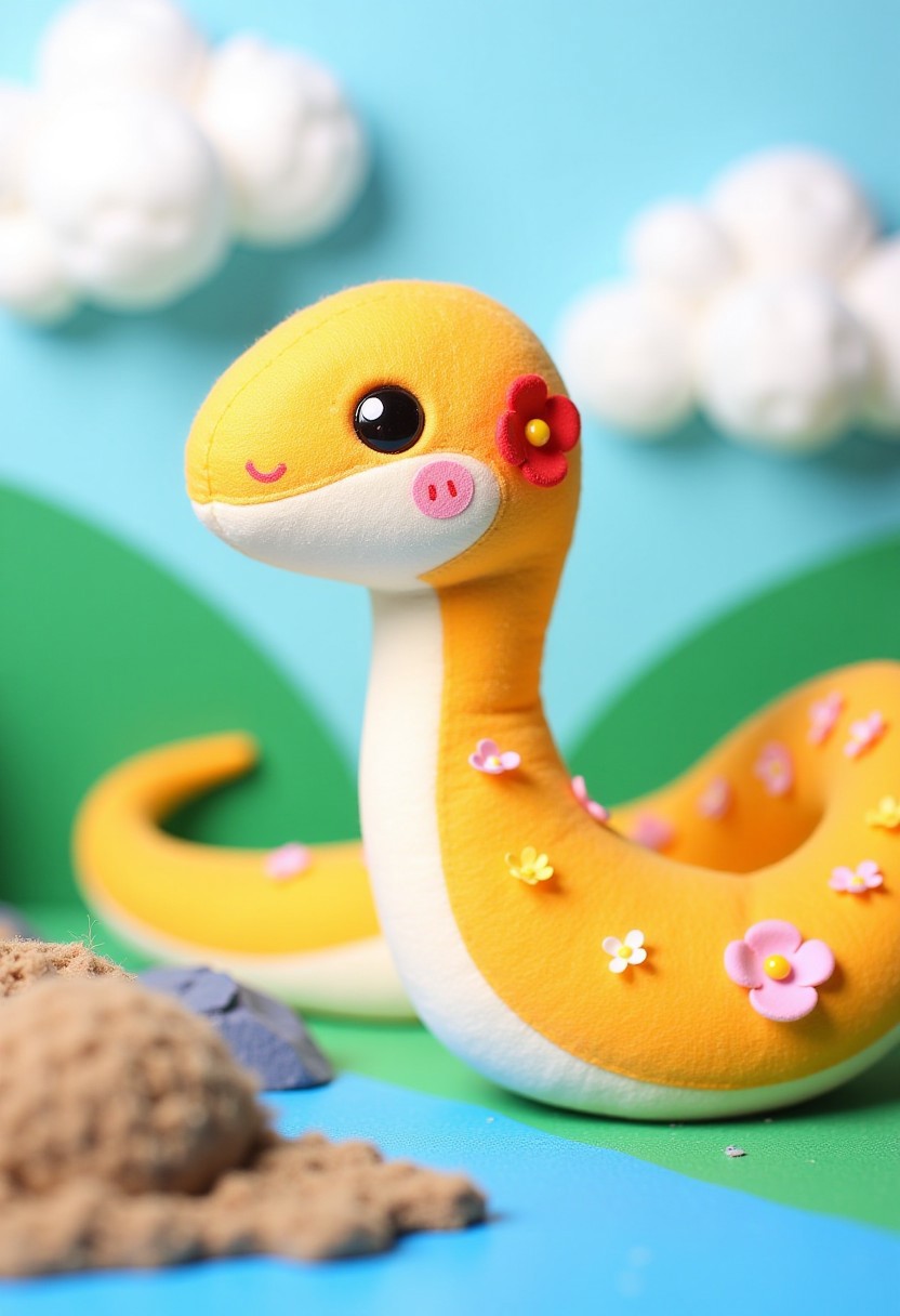 A beautiful photograph of a cute stuffed snake, shebaobao, with stationary background, there is cotton clouds, rocks made of sponge and a river with yarn for knitting simulating water. the snake have black shiny eyes and the body decorated with knitted flowers.