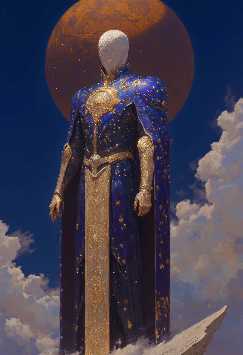 This is a digital illustration in a stylized, dramatic art style featuring a tall, statuesque woman with a commanding presence, standing in a regal pose. She has short, platinum blond hair, accentuating her sharp, elegant features, and wears a grand, flowing robe that cascades to her feet. The robe is a rich, deep blue with intricate gold accents, adorned with ornate patterns and celestial symbols. A large, circular emblem with a radiant, star-like design dominates the center of the robe, while its edges are delicately embellished with golden stars and dots. Her attire also includes a high-collared tunic with gold trim, adding to her air of authority, and a belt with a prominent, circular buckle cinches the ensemble at her waist. Her hands are gracefully clasped in front of her, exuding a sense of composure and strength as she stands on a pedestal or platform, her stance firm and unwavering. The background is a vibrant, deep blue sky, punctuated by soft, fluffy white clouds. A large, orange-brown moon dominates the upper left of the scene, its textured surface partially obscured by clouds, casting a warm, ethereal glow. The overall composition is carefully balanced, with dramatic lighting and celestial elements enhancing the sense of grandeur and otherworldly majesty.