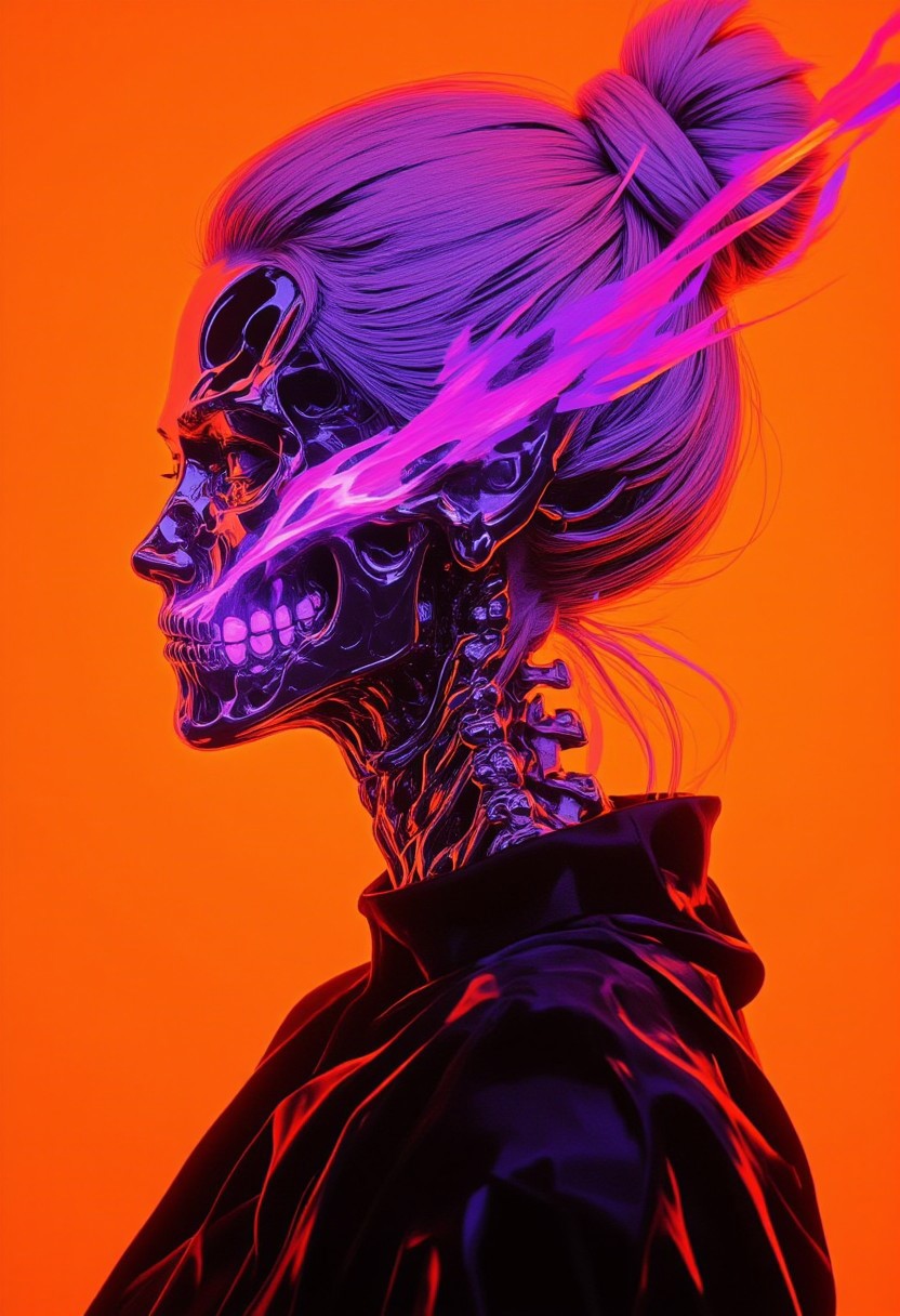 A surreal digital artwork portraying a woman with a transparent head and neck, revealing an intricate skeletal structure within. The glossy metallic gray skull is exquisitely detailed, showcasing the teeth, nasal cavity, and ear structures with precision. Emanating from the skull is a swirling, ethereal aura of vivid purple, pink, and orange hues, blending seamlessly into the vivid orange background, which creates a striking contrast against the darker tones. Her hair is styled into a high, sleek bun, complementing her smooth, pale skin that reflects an almost unreal perfection. She wears a high-necked black garment visible at the base of her neck, grounding the fantastical elements in subtle realism. The texture contrasts are masterfully rendered—her glossy skin and hair juxtaposed with the matte metallic finish of the exposed skeleton. This fusion of organic and inorganic forms merges hyperrealism and surrealism, crafting a mesmerizing balance between beauty and the macabre. (bo-neon, aidmaHyperrealism, sss, translucent, ne0nfant4sy)