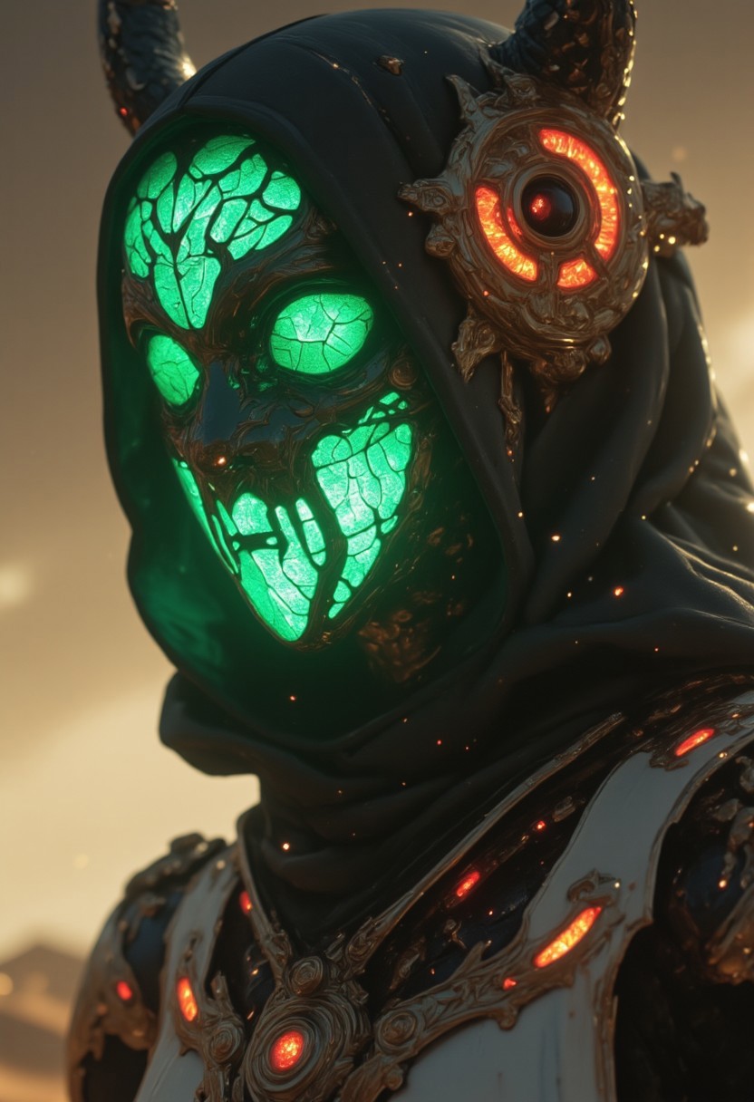 A apoclypse surreal cyberpunk setting under a gritty bleaked beige and Green misty desert sunset, a Closeup Portrait of an eerie horned hkgod sci-fi shinobi nun-scout with billowing octopus backpack in a sandstorm, their holographic crystalline mask glinting like shattered rainbows. Iridescent black amber teal energy veins pulse across their form. The atmosphere is thick with heat distortion, glowing particles floating in the air. dark atmospheric lighting, white cybernetic armor. Wielding a massive sss great sword with intricate translucent engravings, hknuns