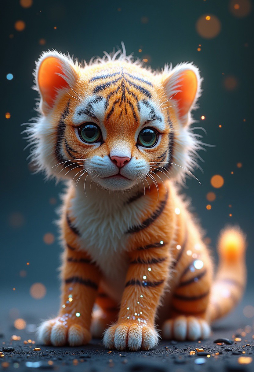 A photorealistic depiction of a unique fantasy pet companion that resembles a small tiger with orsngr tiger striped marble fur and detailed features. Epic insane details, Its fur is made of gleaming, opaque crystals that reflect light in iridescent colors. The creature has an adorable expression and impressive tail, made of fine crystals. Its eyes are sharp and gleaming. When it moves, it leaves a trail of sparkling dust, and its slow but deliberate pace gives it a sense of ancient wisdom. detailed textures, whimsical, cinematic. advntr
