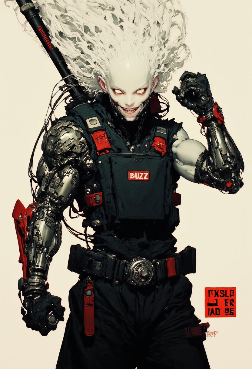 This is a highly detailed, hyper-realistic digital artwork in a cyberpunk style. a muscular Warrior Male character with a pale, almost albino complexion showcasing a sleek, mechanical aesthetic. His skin is adorned with intricate circuitry and cybernetic implants, giving him an otherworldly appearance. He has a lean, athletic build and a confident, almost laughing expression that conveys triumph. He wears a black tactical vest over her chest, adorned with various pouches and straps, indicating a readiness for action. The vest has a small, rectangular label on the chest that reads "BUZZ." His attire includes loose, dark pants that are slightly baggy and feature a utility belt with various pouches and tools. his right fist is clenched and raised toward the viewer in a victorious gesture, exuding confidence and determination. His left arm is a cybernetic limb, with exposed wires and mechanical parts visible, adding to His futuristic and powerful appearance.