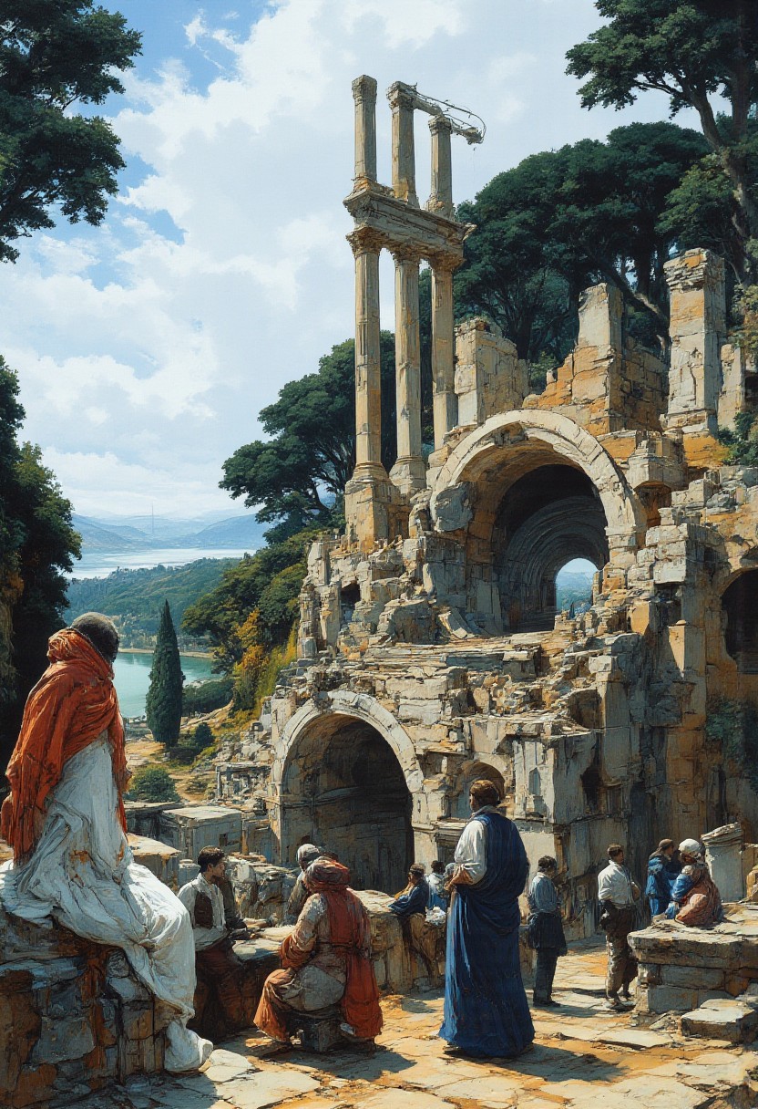 This image is a detailed, classical art by Jean-Baptiste Regnault, titled "The Ruins of Paestum." It showcases a picturesque, ancient Roman ruin scene set against a backdrop of a serene, partly cloudy sky. The foreground features a partially collapsed, large stone structure with multiple columns, some still standing, while others lie in ruins. The columns are intricately detailed with weathered textures and deep shadows, suggesting their age and decay. In the foreground, to the left, a woman in a flowing, white dress and a red shawl sits on a stone bench, gazing out at the scene. To the right, a man in a white tunic and a woman in a red dress and a white headscarf are seated on a stone ledge, engaged in conversation. Another man in a white tunic and a woman in a blue dress stand nearby, possibly discussing the ruins. The background reveals lush green trees and rolling hills, with distant mountains and a serene lake or river visible. The colors are rich and vibrant, with earthy tones dominating the foreground and the sky transitioning from blue to soft white clouds. The painting captures a sense of tranquility and historical significance, emphasizing the beauty of decay and the enduring allure of ancient ruins.