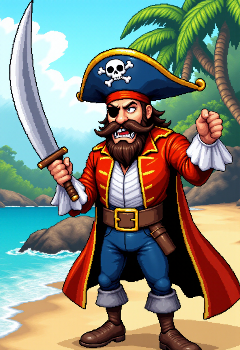<lora:KFT_2d_Pixel_Style_FLUX-000017:1> The image is a vibrant kftpxl pixel art illustration featuring a pirate captain wielding a cutlass