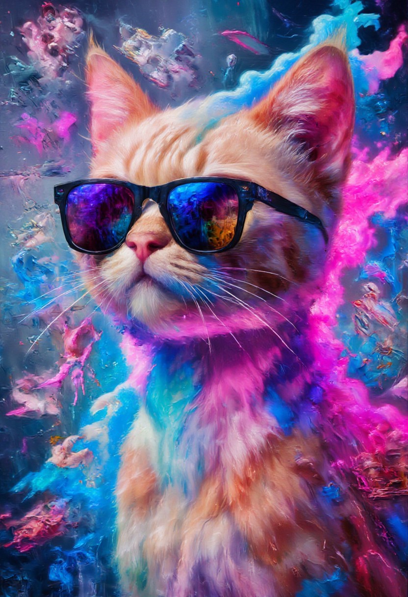 Create a photorealistic close-up image of a cat wearing oversized, pixelated sunglasses, sitting in front of a glowing computer screen filled with vibrant, chaotic internet memes. The cat’s fur is a soft mix of orange and white, with its eyes half-closed in a smug, "I’m too cool for this" expression. The sunglasses are exaggeratedly large, with a retro 8-bit pixel design that perfectly matches the online meme culture. Around the cat, the screen glows with bright neon colors, flashing images of popular internet memes, like "Doge," "Grumpy Cat," and "This is Fine" dog. The background is filled with a mix of computer icons and pixelated graphics, creating a sense of digital chaos. The lighting is a soft glow from the computer screen, casting a gentle blue and purple hue on the cat's fur and enhancing the meme-filled atmosphere. The composition exudes a playful and humorous vibe, blending the charm of the cat with the vibrant and chaotic energy of internet culture. Ultra-quality, 8k, best quality, a masterpiece, award-winning, midjourneyv6.1.