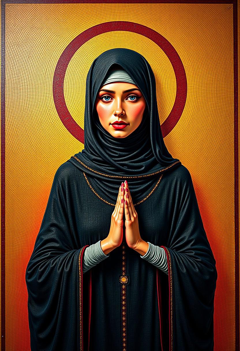 A colorful byzantine style mosaic with golden glow depicting in propaganda style an anarchist hero of the byzantine empire. she wears a dark robe with big hood.