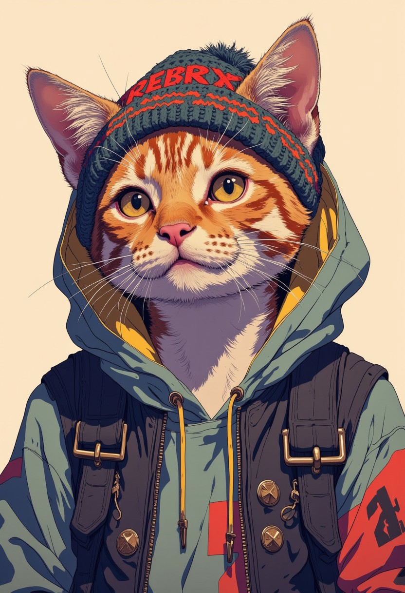 A cute cat wearing a cozy hoodie and a woolen cap, looking adorable and stylish. DB4RZ, DB4RZ style painting, in the style of cksc, anime, cyberpunk