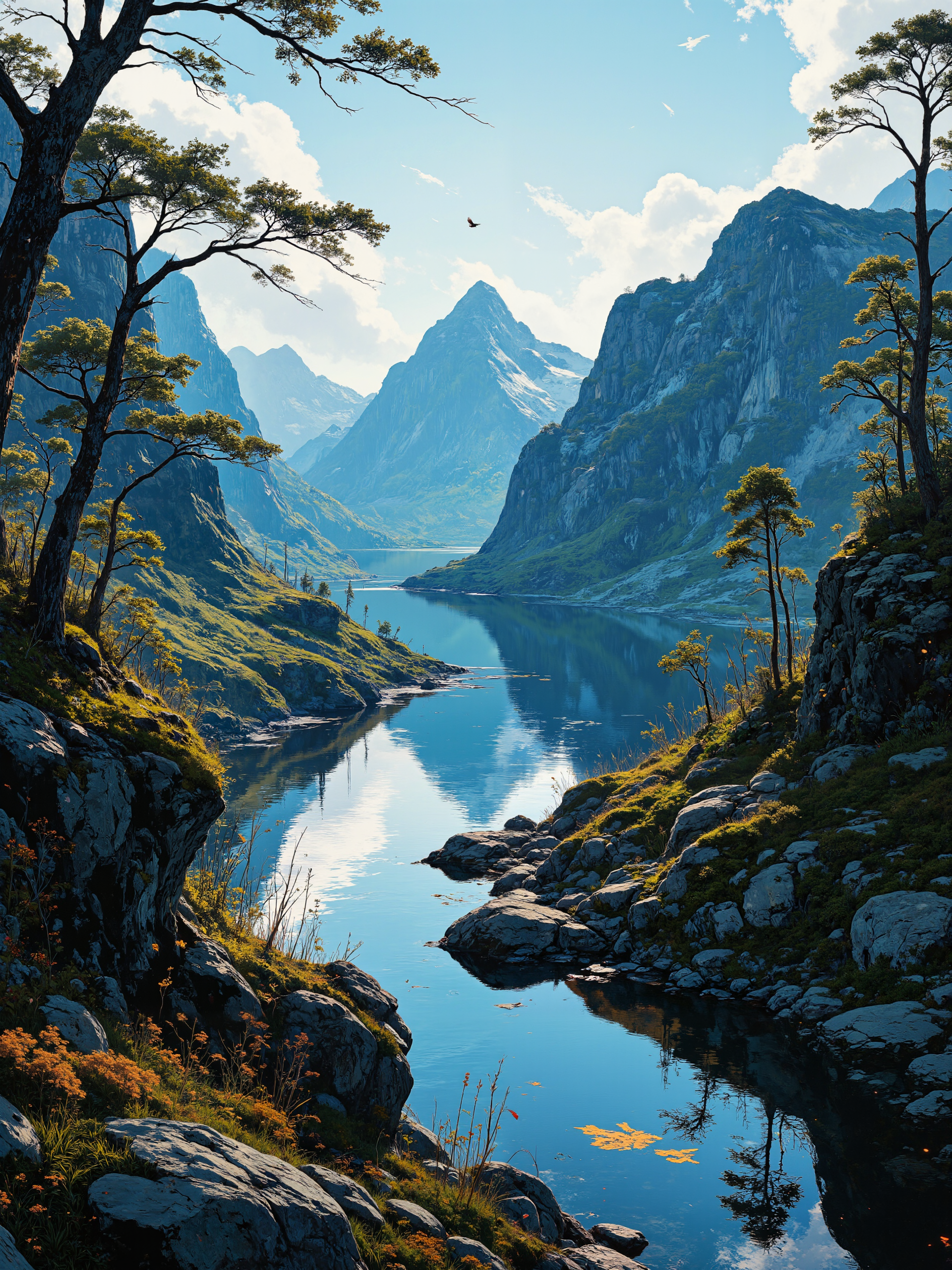 Majestic fjords with towering cliffs, deep azure waters, untouched wilderness, northern pine forests, vibrant moss-covered rocks, pure air clarity, serene harmony with native wildlife, Nordic color palette, crisp natural lighting, reflects on tranquil water surfaces, 8k rendering, masterpiece landscape, intricate ecological details, breathtaking virgin territory, immersive scale and perspective, effortless interaction of natural elements, captured in stunning realism <lora:Kodak Motion Picture Film style v1:0.3> <lora:Ethereal Brush Anime v2.0:0.6> <lora:Anime v1.3:0.7> <lora:aidmaMJ6.1-FLUX-v0.4:0.5> <lora:Improved Amateur Realism:0.3> <lora:flux_dev:1>
