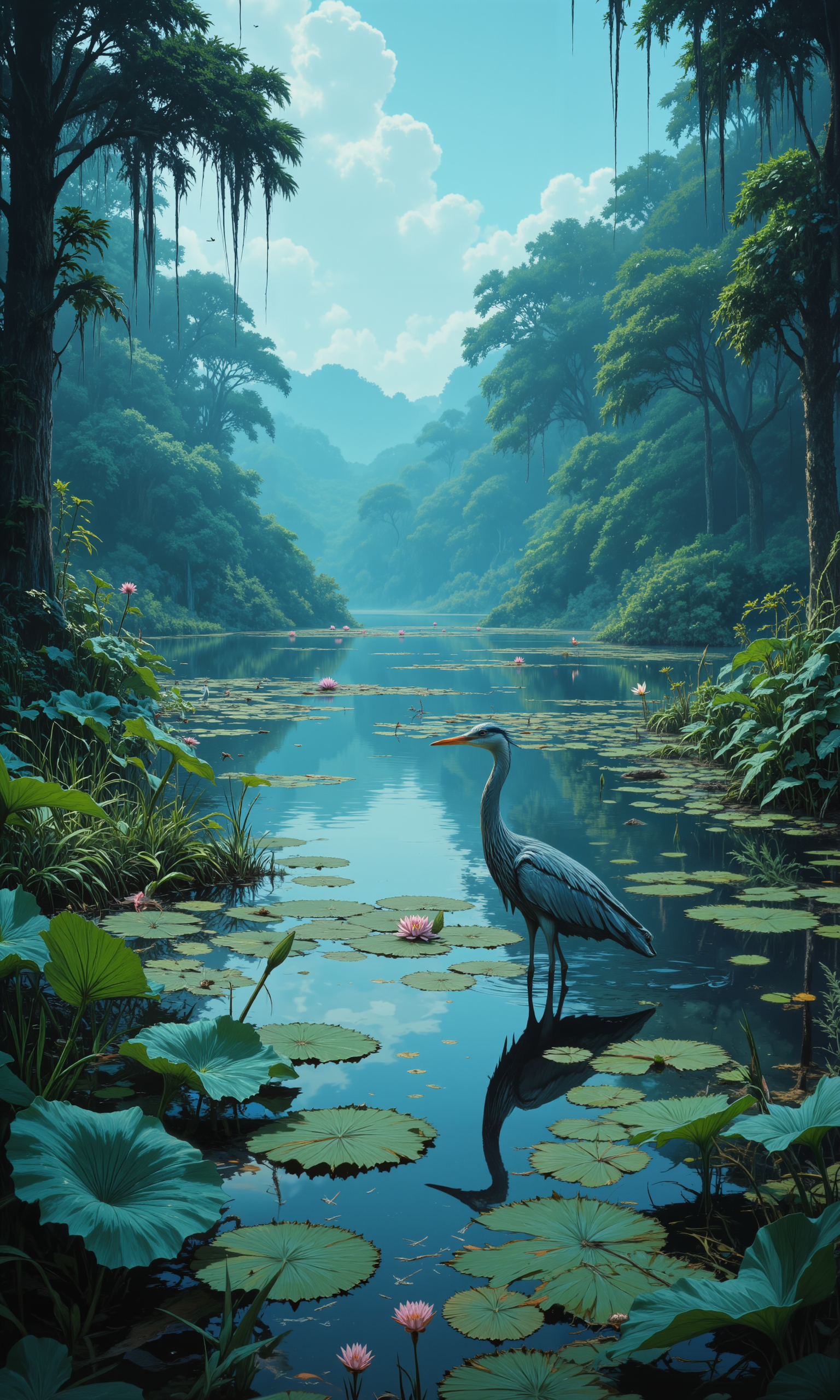Serene landscape, untouched wetlands, reflective mirror lakes, virgin swampland, lily pad arrays, naturally tranquil environment, native birdlife, dragonflies in motion, lush aquatic plants, silver-grey herons wading, rich emerald greens, sapphire blue skies, pristine dawn light, soft atmospheric mist, harmonic natural balance, ecological equilibrium, intricate detail, 8k resolution, wildlife masterpiece, natural tranquility, subtle rippling water reflections, careful ecological harmony <lora:Semi-realisticPortraitPainting:0.4> <lora:FluxMythAn1meL1nes:0.5> <lora:FluxFantasyDetailerV2:0.6> <lora:NeonFantasyPrimeFLUX-000049:0.5> <lora:FluxMythR3alisticF:0.3> <lora:flux_dev:1>
