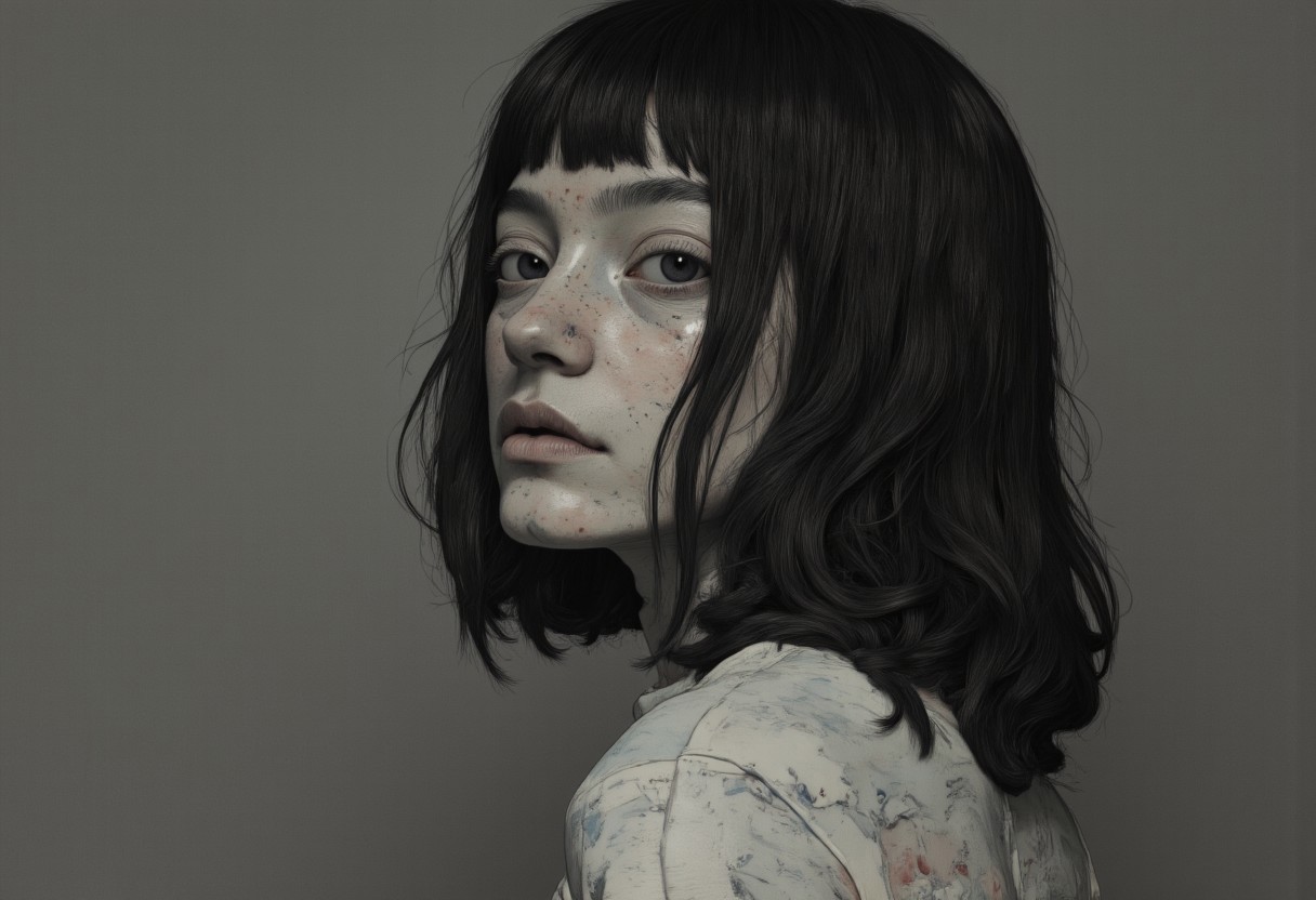 a young woman with straight, shoulder-length hair and prominent, dark bangs. Her face is blurred, creating a sense of anonymity or abstraction. The image employs a high-contrast, grayscale palette, which emphasizes the textures and contours of her skin and hair, giving it a stark, almost ethereal quality. The lighting is soft yet directional, likely from an artificial source, casting gentle shadows that enhance the three-dimensionality of her face and upper body. The use of light and shadow creates a chiaroscuro effect, reminiscent of Baroque art, which adds depth and mood to the composition. The light source seems to come from the front and slightly above, casting a soft glow on her face and creating a gentle contrast with the darker areas of her hair and clothing. The camera angle is slightly above eye level, looking down at the subject, which can be interpreted as a way to emphasize her anonymity and vulnerability. The texture of the background is smooth, which contrasts with the more intricate details of her face and hair, drawing the viewer's focus directly to her. Overall, the image evokes a sense of introspection and mystery, typical of modern portrait photography that explores themes of identity and anonymity.