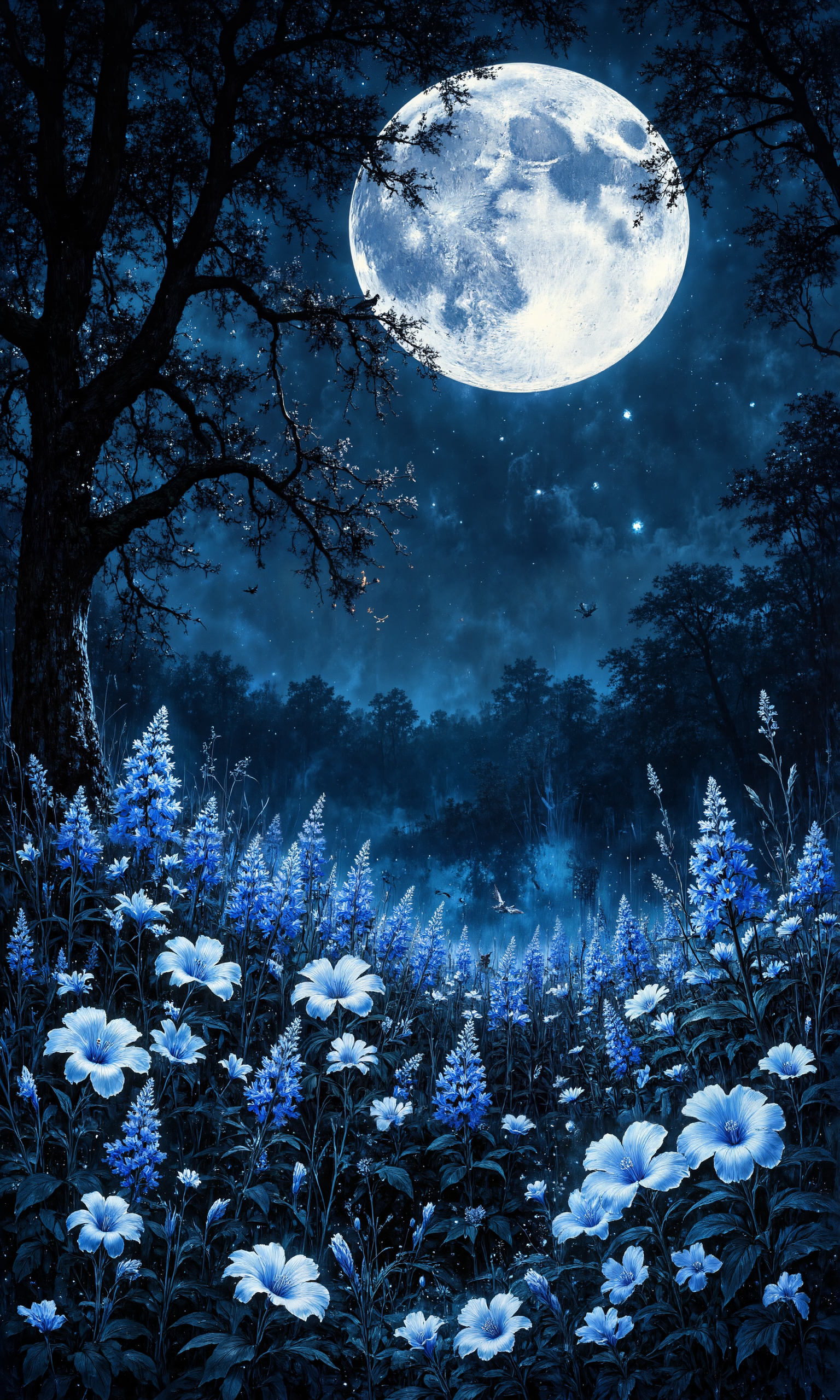 Ethereal moonlit meadow, bioluminescent flowers glowing softly. Diverse flora: blue ghostly lupines, iridescent daisies, shimmering grass. Silvery mist swirling low, catching moonbeams. Fireflies dance, leaving trails of light. Dewdrops on petals reflect starlight. Ancient oak silhouette, branches stretching across night sky. Mystical atmosphere, cool blue tones with hints of purple and teal. Gentle breeze rustling leaves, creating ripples across field. Nocturnal wildlife: owl perched, foxes peering from shadows. Ultra HD, photorealistic, intricate details, 8K resolution. Soft focus edges, sharp center. Cinematic lighting, long exposure effect. <lora:SameFace_Fix:0.3> <lora:Mezzotint_Artstyle_for_Flux_-_by_Ethanar:0.8> <lora:FluxMythP0rtr4itStyle:0.9> <lora:RetroAnimeFluxV1:0.4> <lora:aidmaMJ6.1-FLUX-v0.4:0.3> <lora:flux_dev:1>