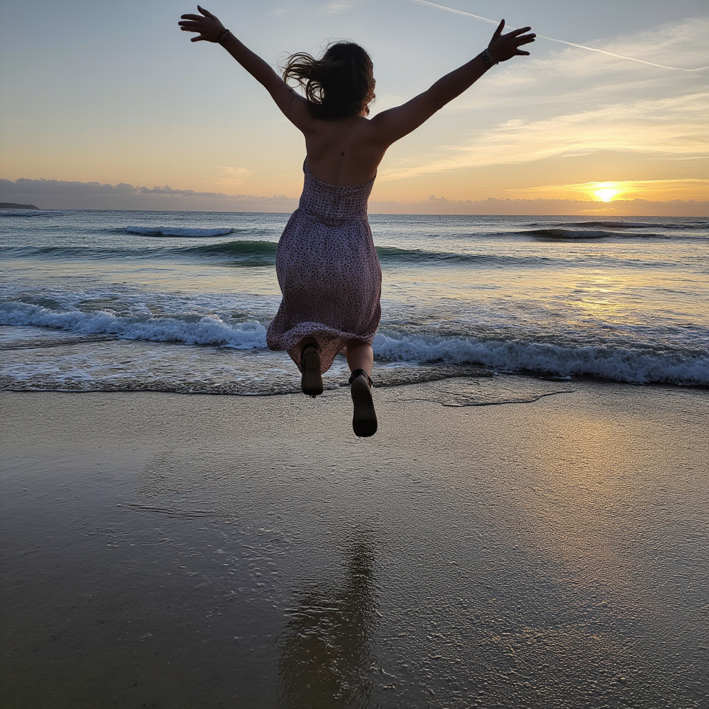 early 2010s snapshot photo captured with a phone and uploaded to facebook, A young woman jumping in the air with excitement on a beach, wearing a sundress and sandals, with her arms stretched out wide. The background is a sunset over the ocean, with soft waves.