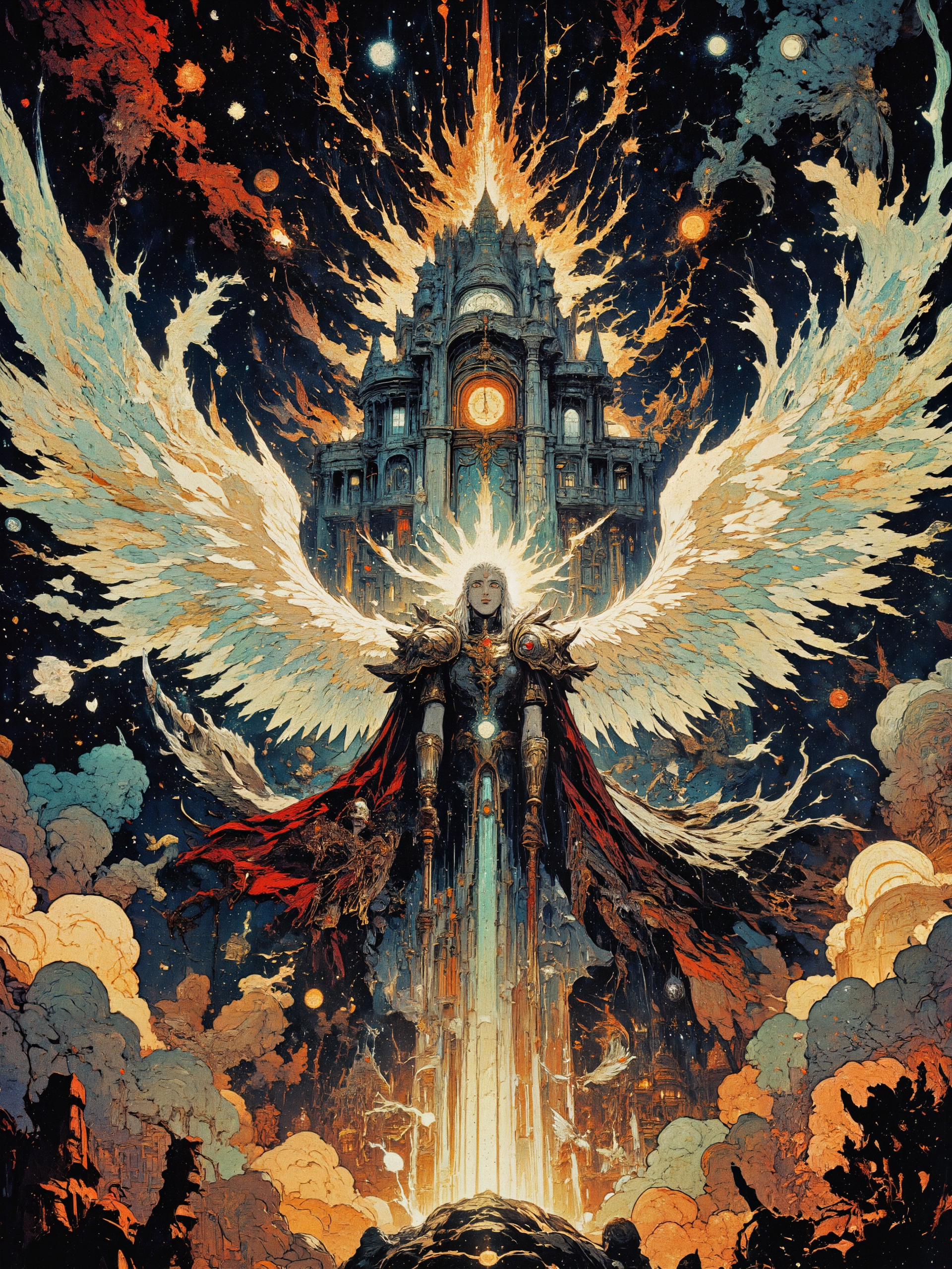 Majestic, glowing celestial palace, suspended in the endless night sky, intricate architecture resembling ancient divine temples, shimmering with ethereal, silvery luminescence. Surrounding the palace, a cascade of radiant, luminous clouds, shifting in iridescent colors, creating an enchanting atmosphere. In the foreground, a powerful, winged deity with majestic wings unfurled, adorned in resplendent, celestial armor, encrusted with celestial gems. The deity holds a magnificent, luminous scepter, shimmering with cosmic energy, casting a vibrant glow on ethereal surroundings. In the sky, constellations and astral formations weave together, forming divine symbols, offshoots of celestial light cascading down. The cosmic backdrop pulsates with mystic energy, echoes of divine chants resonating through the celestial expanse. High-quality, 8k resolution, masterpiece, intricate details, dynamic lighting, enchanting atmosphere, inspired by celestial mythology, epic scale, harmonious composition. <lora:RetroAnimeFluxV1:0.7> <lora:Comic book V2:0.9> <lora:FluxMythG0thicL1nes:0.7> <lora:reedy-art-style:0.9> <lora:Memadukan_Brush_Strokes_of_Fineart:0.4> <lora:flux_dev:1>