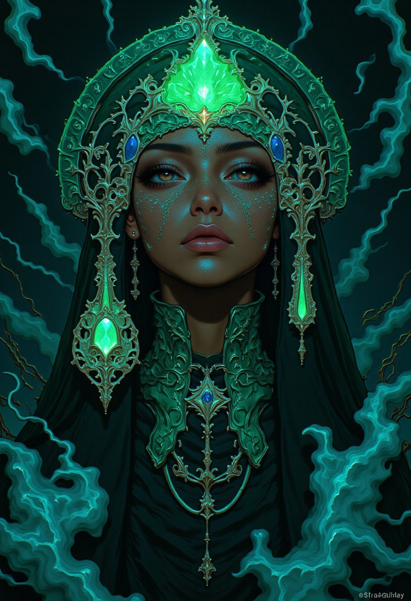 A highly detailed digital painting with hard sketching elements, exuding an aura of surreal sophistication. The subject is a woman with bronze skin, wearing an ornate headscarf in a glowing emerald green hue, concealing all but her radiant, glowing silver lips. The headscarf features shimmering silver-threaded floral embroidery with delicate filigree-style detailing along its edges. Her deep auburn hair peeks subtly from beneath the scarf, styled into delicate waves. A glowing silver chain adorned with radiant sapphire crystals hangs from her lips, serving as the centerpiece of the composition. The background swirls with surreal fractal patterns in glowing hues of sapphire blue and emerald green, creating a hypnotic, dreamlike atmosphere. The interplay of cool glowing tones against the hard sketching details adds a captivating contrast to this modern yet classical piece.