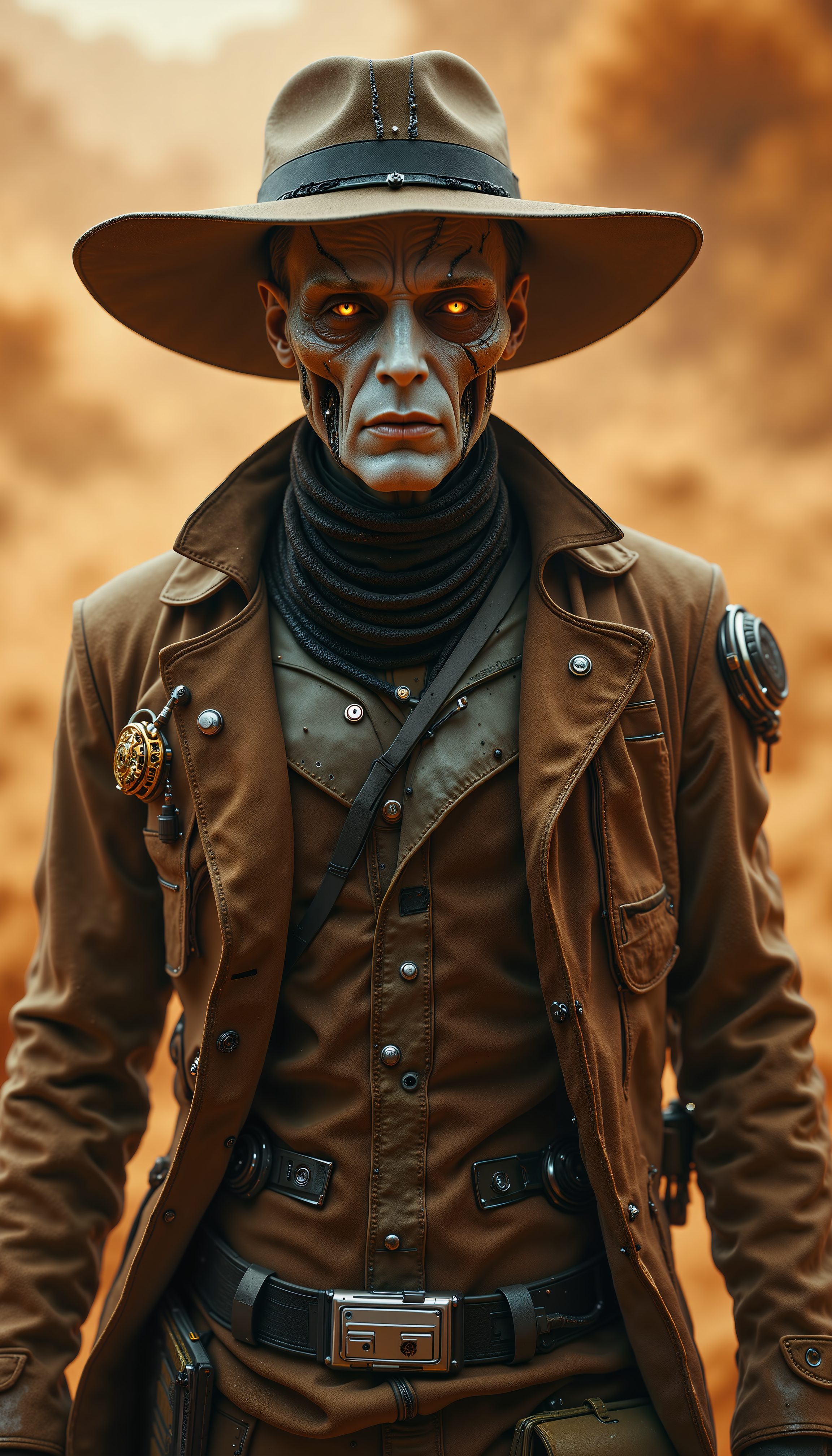 In a haze of swirling orange dust, an alien figure stands front and center, his leathery, pale-blue face partly hidden by a broad, weathered hat. Two metallic tubes connect from his cheeks to a device on his chest, hinting at a specialized breathing apparatus. His narrow, crimson eyes gleam with wary focus above a set of thin, angular lips. A heavy, worn coatâadorned with subtle rank markingsâcovers a utilitarian uniform. Grainy sand clings to every crease, conveying an unforgiving desert environment. Despite the harsh backdrop, he maintains a poised, resolute stance, exuding an aura of controlled menace rooted in both skill and secrecy.