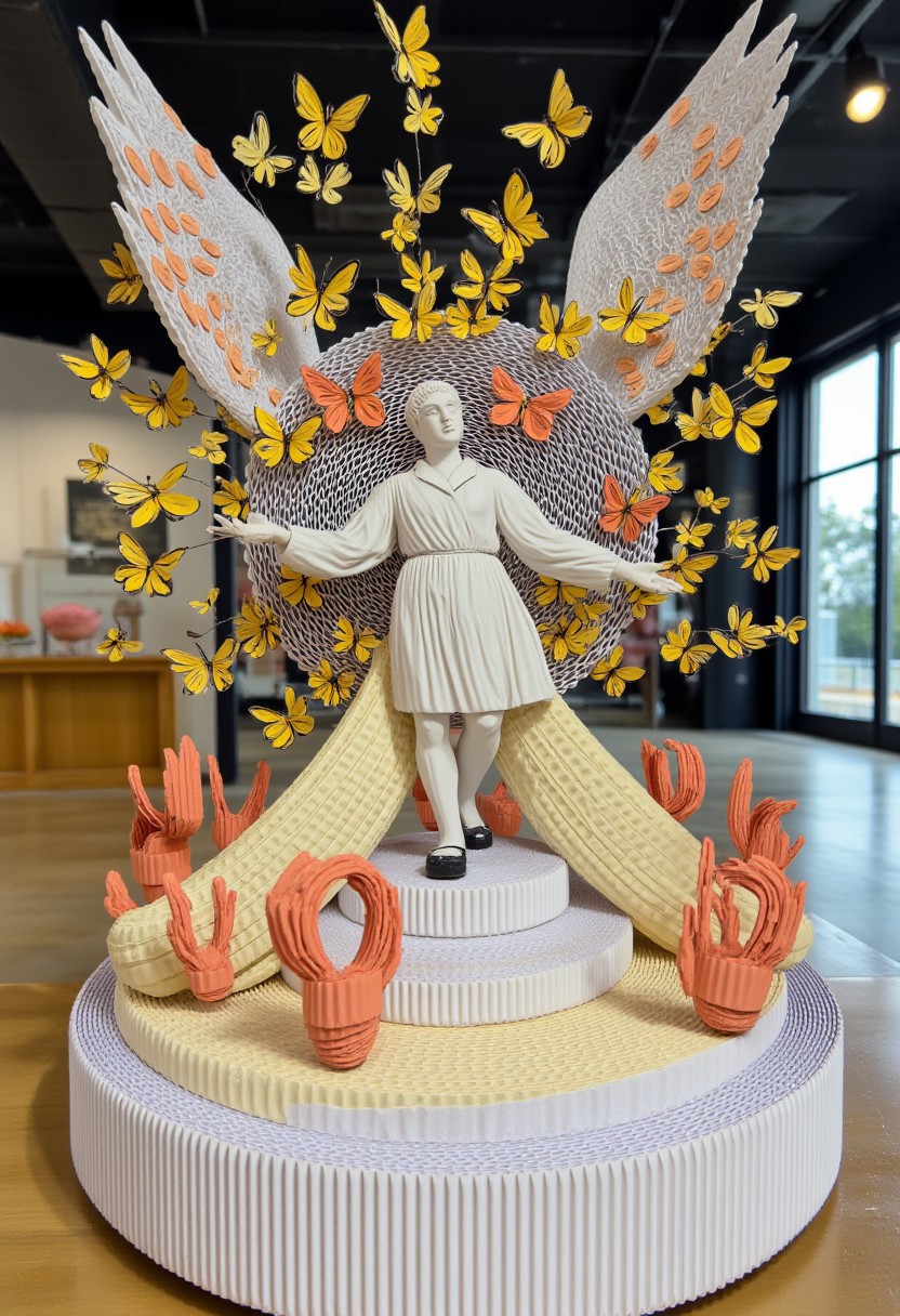 A captivating museum installation titled "Reality's Edge" featuring a colossal paper art piece where a classical marble statue emerges from thousands of origami butterflies, but as the statue reaches forward, its hand dissolves into geometric paper patterns that transform into flying books with pages that become birds. The central figure appears to be stepping through a portal made of architectural blueprints that fold themselves into impossible MC Escher-like staircases, while mathematical formulas cut from paper float upward, transforming into constellations, paperarthk,aidmamj6.1