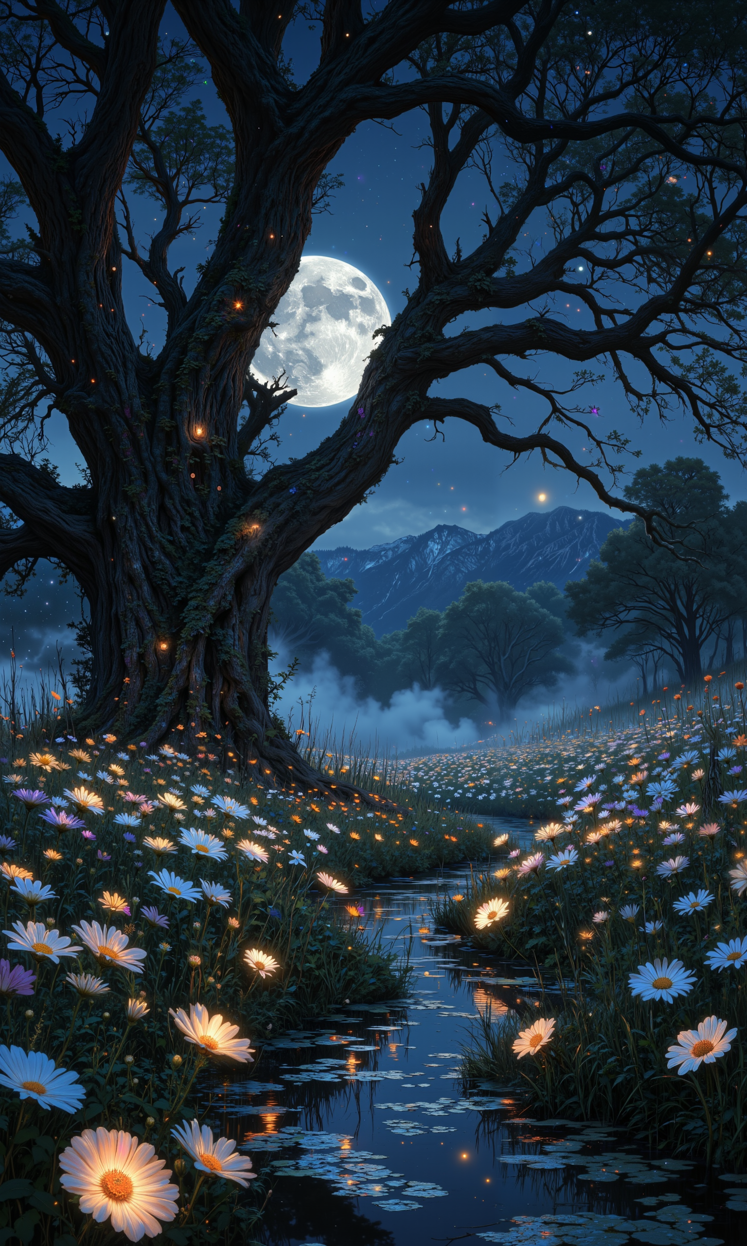 Ethereal moonlit meadow, luminous fireflies dancing over a sea of iridescent wildflowers. Silvery mist curls around ancient oak trees, their gnarled branches reaching skyward. Soft, cool moonlight bathes the scene, creating a dreamy atmosphere. Delicate dewdrops glisten on petals and blades of grass. A gentle breeze carries the sweet scent of night-blooming jasmine. Tiny nocturnal creatures peek out from lush foliage. Stars twinkle in the deep indigo sky, mirrored in a tranquil pond. Hyper-detailed 8K rendering, masterful composition, intricate textures, and sublime lighting. Photorealistic quality with a touch of fantasy. <lora:Rainbow_on_black_style-000003:0.7> <lora:Semi-realisticPortraitPainting:0.8> <lora:Blue_Future:0.3> <lora:flux.1_lora_flyway_Epic-detail_v2:0.3> <lora:FluxFantasyDetailerV2:0.5> <lora:flux_dev:1>