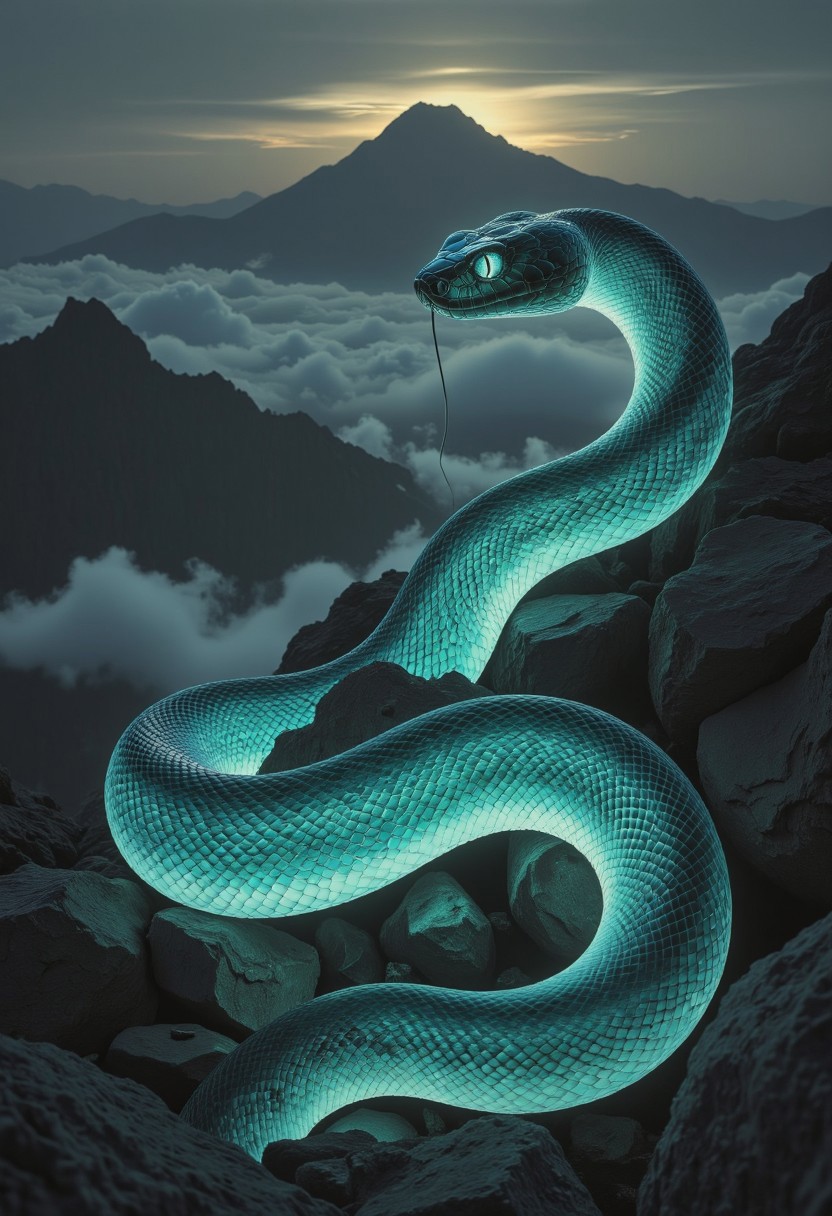 A serene mountain landscape featuring, A mysterious sss dark-turqoise translucent luminous snake walks through the black mist-shrouded mountain peaks By night, traditional ink painting style, monochromatic tones in tranquil ambiance with vivid translucent color spots, FLUX model, Year of the Snake theme