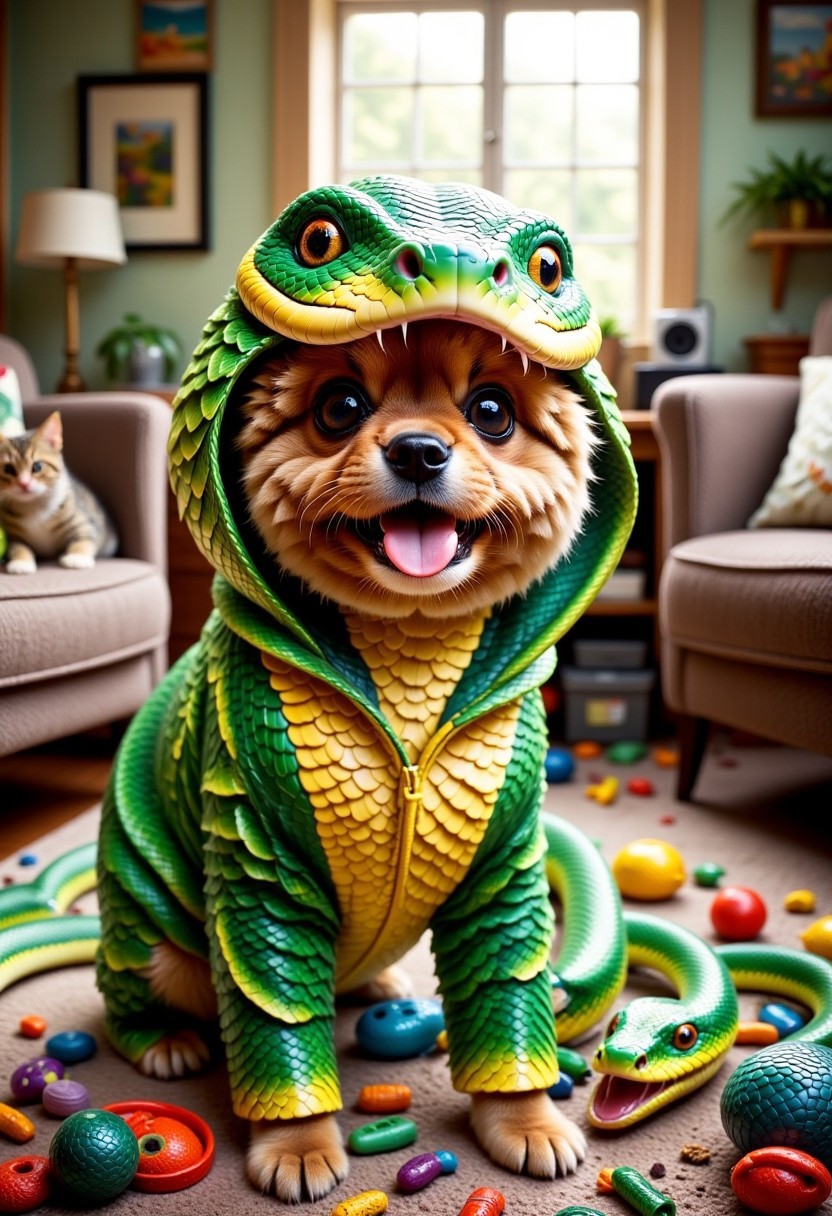 A comically adorable pet dressed in a vibrant, oversized sn4k3 snake costume, complete with exaggerated scales and a playful, forked tongue. The pet, with its wide, curious eyes and cheerful expression, sits amidst a clutter of colorful toys and treats in a cozy living room. The snake costume features bright green and yellow patterns, wrapping around the pet’s body in a hilariously snug fit. Surrounding the scene are playful elements like scattered squeaky toys, a sunny window with dappled light streaming in, and a curious cat peeking from behind a couch, adding to the lighthearted and amusing atmosphere.