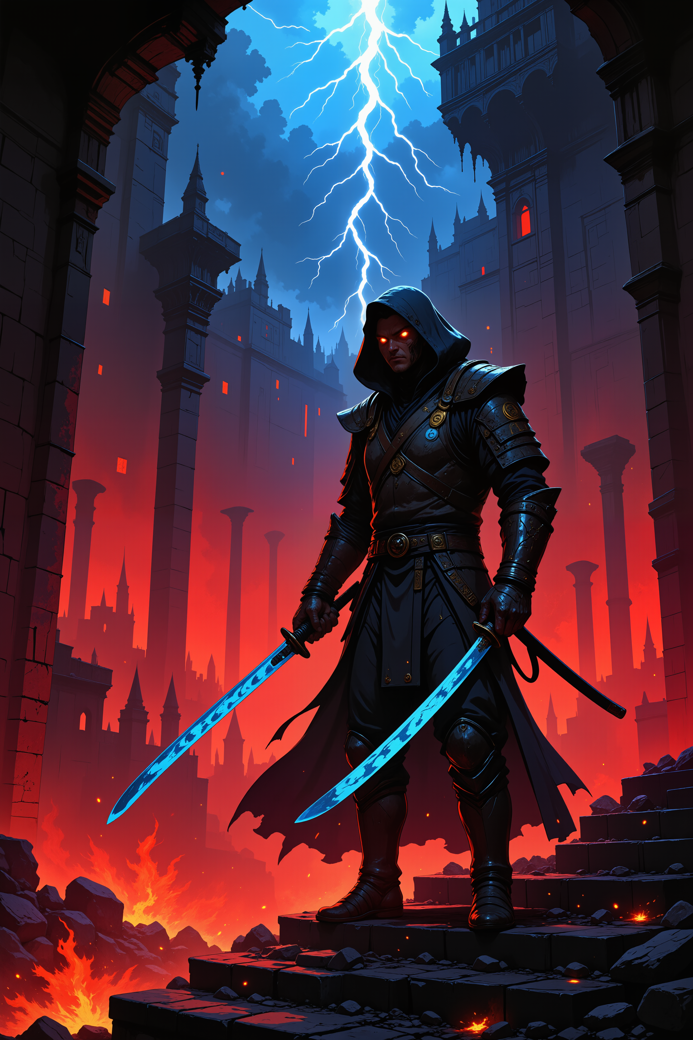 At the apex of a spiraling, obsidian staircase that seems to climb endlessly into a stormy, blood-red sky, a weaponmaster clad in weathered, steel-gray armor stands poised with twin katanas in hand. The blades gleam with a faint, blue glow, etched with runes that pulse in rhythm with the crackling lightning overhead. Surrounding him, jagged columns of dark stone erupt from the staircase at irregular angles, creating a chaotic, labyrinthine silhouette. The air around him swirls with ash and embers, and the distant roar of thunder mixes with the low hum of the vibrating blades. His stance is balanced and precise, one katana raised in a defensive guard, the other angled toward the invisible enemy above. His face, partially obscured by a cracked mask, reveals eyes that burn with an unyielding determination. Below, the staircase descends into a yawning abyss, glowing faintly with a molten red light, as though the core of the world churns beneath him. The scene is a powerful juxtaposition of raw elemental chaos and the weaponmaster's unshakable composure, a dynamic moment suspended in time. , detailed background Fantastic lighting. Detailed shadows.intricate details, vivid colors, hyper-detailed, ultra-sharp, High resolution, high detail. Highly detailed. , <lora:Dark_and_Colorful_FLUX_OT:0.5><lora:Anime v1.3:0.3><lora:Modern Cartoon - s0_8 g4_5:0.5><lora:Flux_Fantasy_Portraits:0.5>