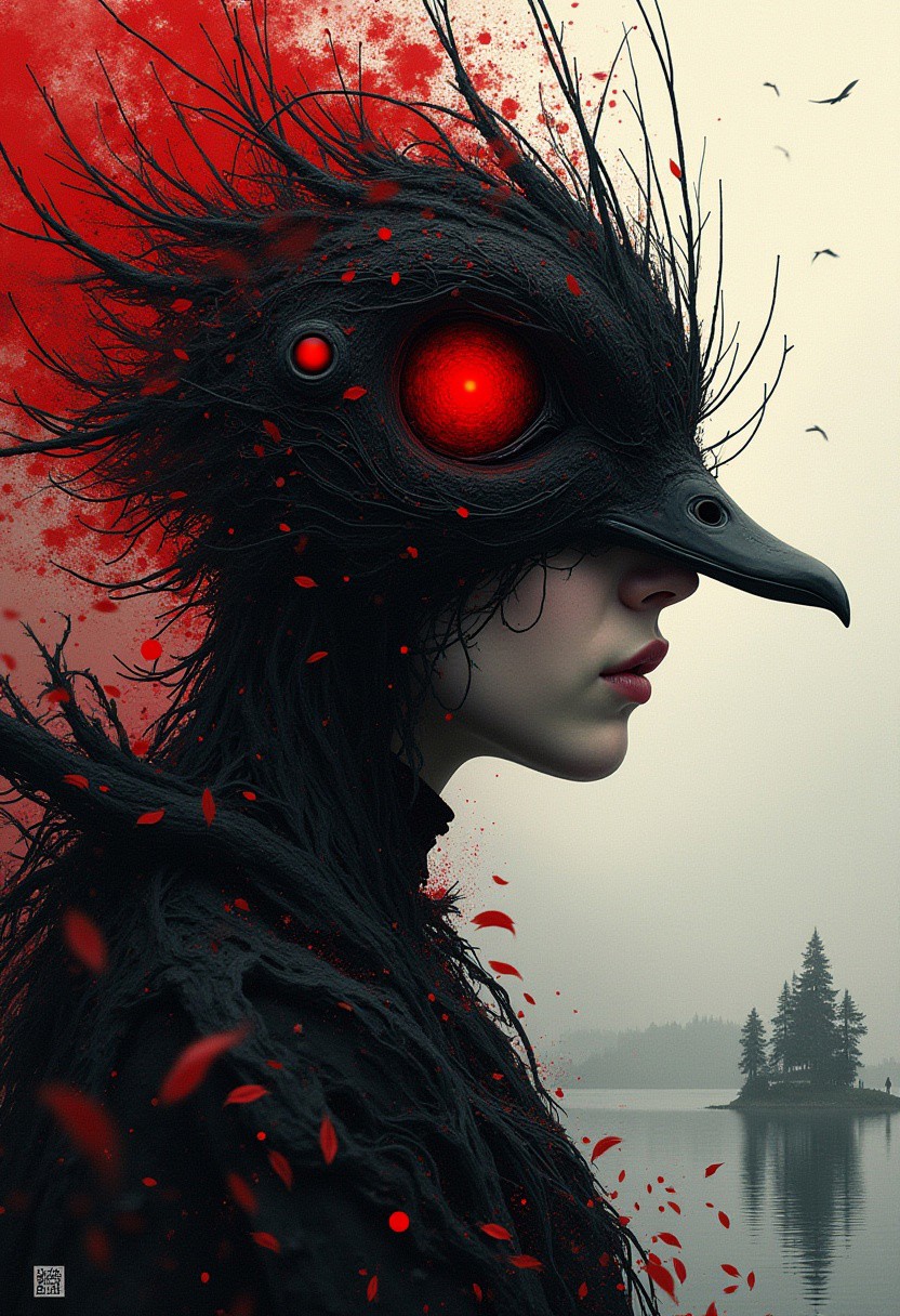 artistic, portrait, synthetic duck mechanic, complexity with details, empty eye, lake, tree islands, limited colors are black and red, dystopia atmosphere, tsutomu nihei, many details, stylize
