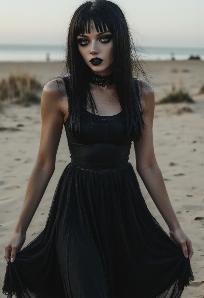 FictionalCrystal, a goth girl with heavy black eye makeup and black lipstick. Lifting skirt to show boobs