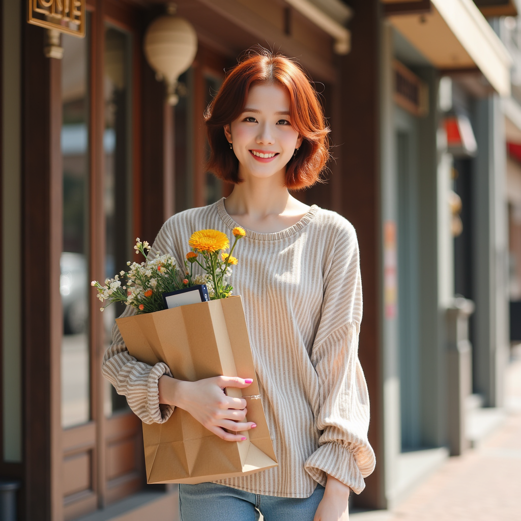 jisoowiro, A girl with short auburn hair and fair skin, dressed in a striped long-sleeve shirt and light blue jeans. She stands in front of a small bookstore, holding a paper bag filled with flowers and books. Ultra-HD, realistic, emphasizing her natural style and the charming street setting